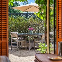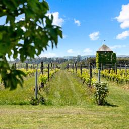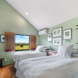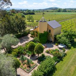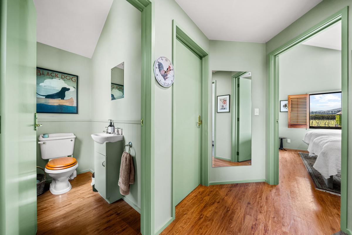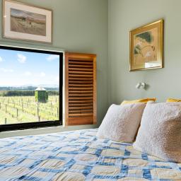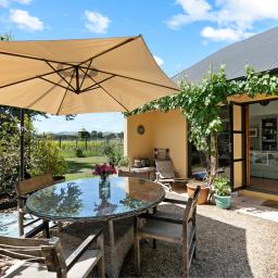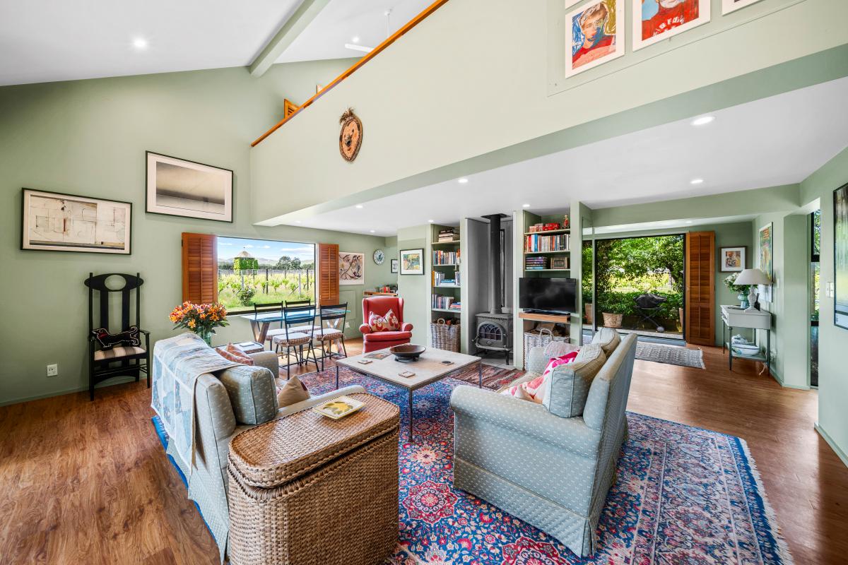 Step through french doors to the living area warmed by a log burner, and kitchen and dining areas that frame picture-perfect views of the vines beyond.