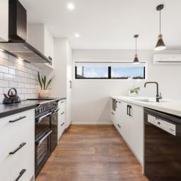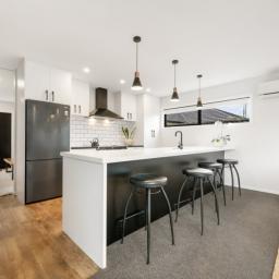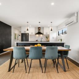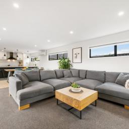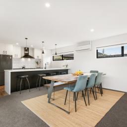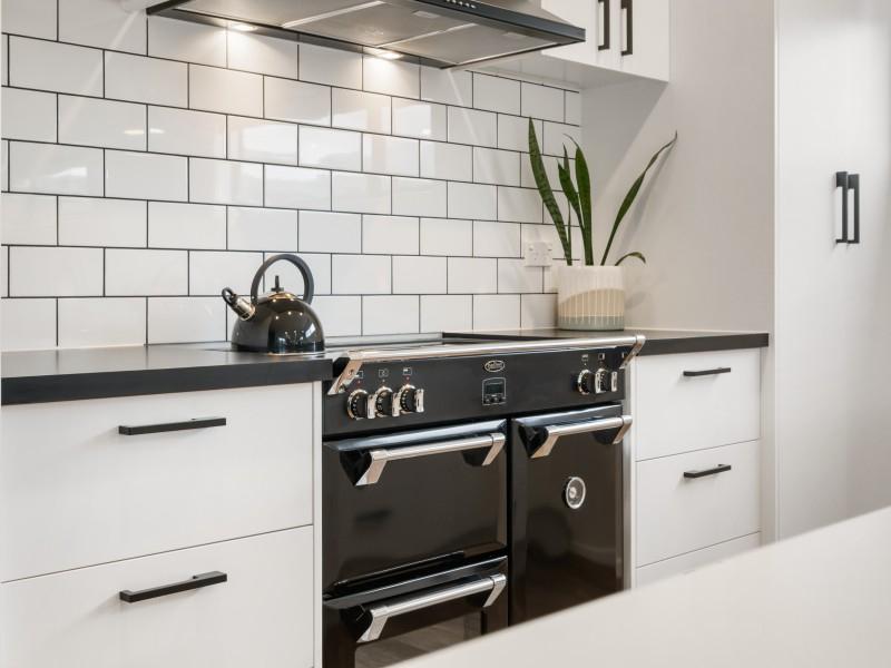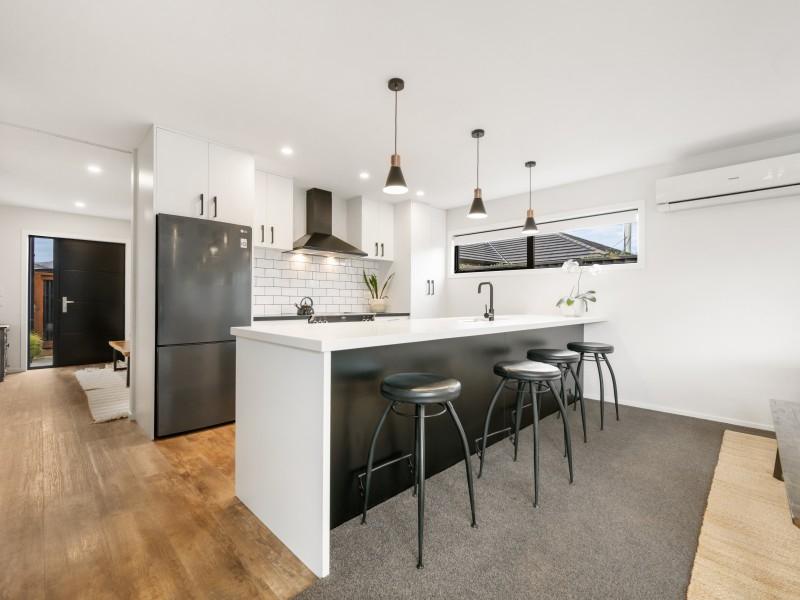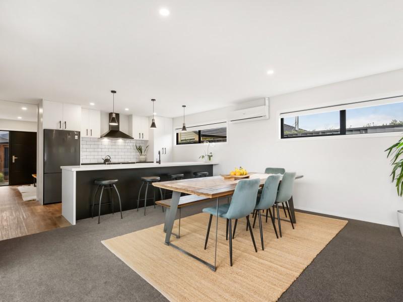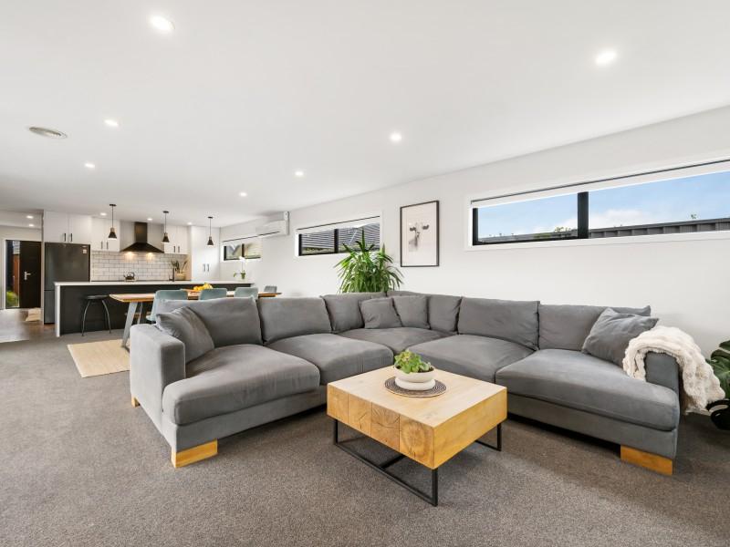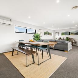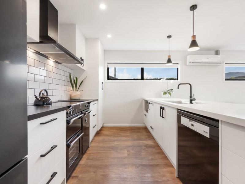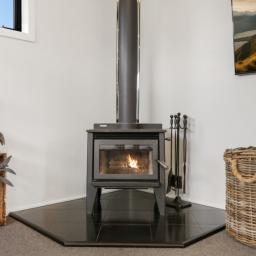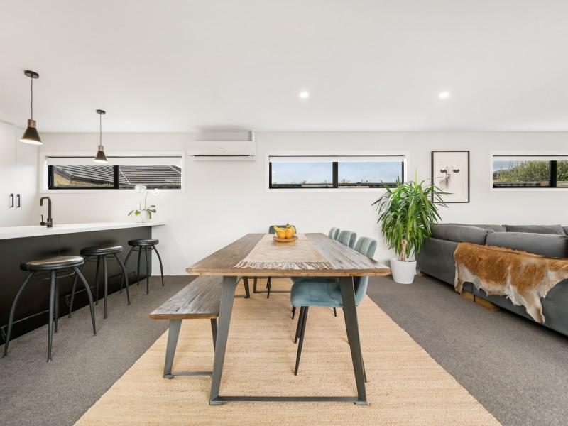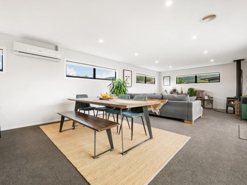 Inside, the modern kitchen features a large Belling oven, induction cooktop, and an inviting island breakfast bar. Comfort is assured year-round with a wood fire, heat transfer system, and heat pump, while large sliding stacker doors bring the outdoors in.