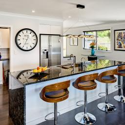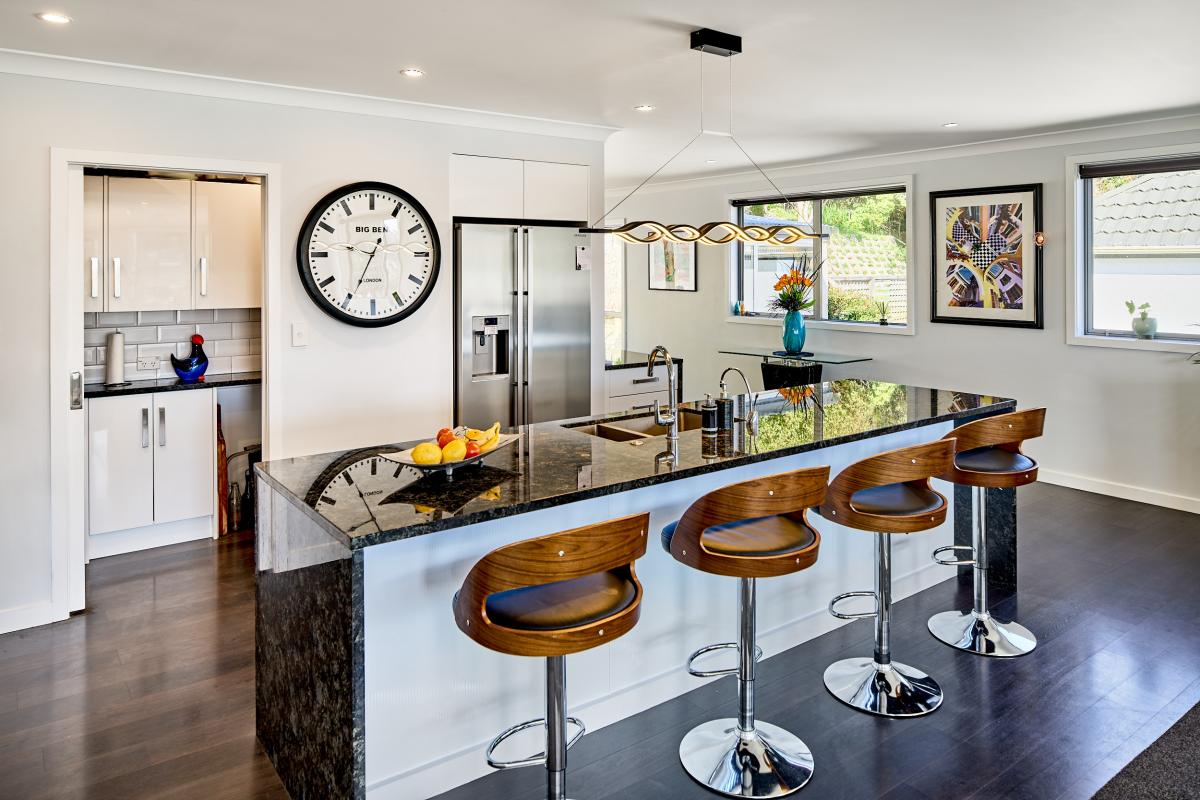 Moving upstairs, is the heart of the home and where its architectural brilliance truly shines. Designed around the 180-degree outlook the open-plan living and dining space flows seamlessly to an expansive wrap around deck enclosed by glass balustrades. The kitchen is a showpiece, an entertainer’s dream featuring granite benchtops, a huge island bench, a six-burner gas stove, and a walk’n pantry. Whether hosting a dinner party or enjoying a quiet morning coffee, the light, warmth, and views make this space unforgettable.