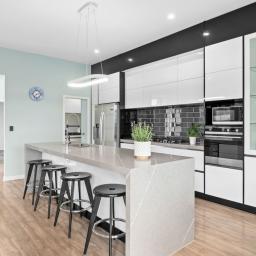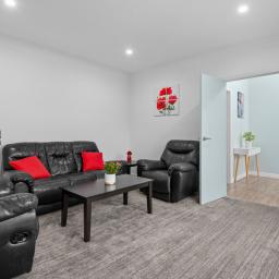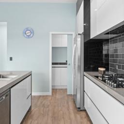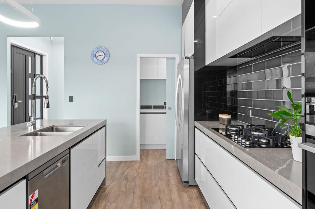 Enjoying an elevated outlook, the superb central living zone offers the very best in modern day living with a 3-metre-high stud height and plenty of glazing to create a light and airy living environment. Enhanced by feature LED lighting, the galley style kitchen weaves together form and function with sleek gloss cabinetry, quality stainless appliances, 5 burner gas hob and scullery. Through double doors, the formal lounge is able to be completely shut off -making it ideal for all your media requirements, peace or privacy.