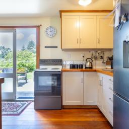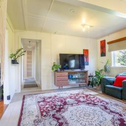 The open plan kitchen and dining areas flow seamlessly to a sunny deck and onto lawns to enjoy with family and friends. The living area has a lovely cozy feel and features a heat pump for those cooler months.