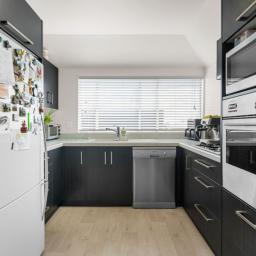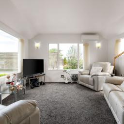 Upstairs is the heart of the home, where light-filled open-plan living connects the kitchen, dining, and lounge. Large windows capture elevated views, while the adjoining balcony provides an inviting space for a quiet coffee or fresh air. The kitchen offers excellent storage and bench space, keeping everyday living practical and easy.