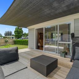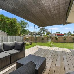 The comfortable and homely lounge featuring lovely polished wooden floors opens out through a ranch slider to an excellent deck with a shade sail for the lovely summer evening sunsets and BBQs with family and friends.