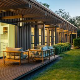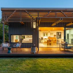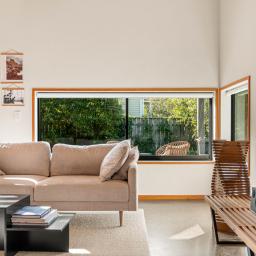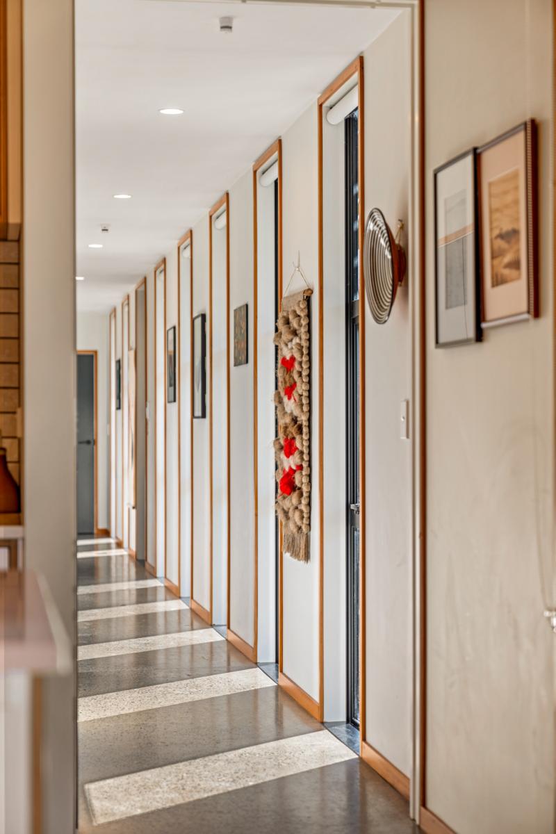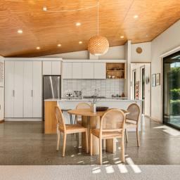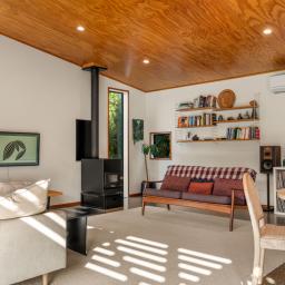 Inside, polished concrete floors, white plaster walls, ply ceilings and timber detailing create a restrained, sophisticated palette that balances warmth and texture. Outside, vertical board and batten meets horizontal cedar, forming a striking facade that nods to local architectural traditions while making a contemporary statement.