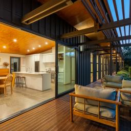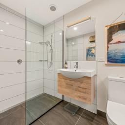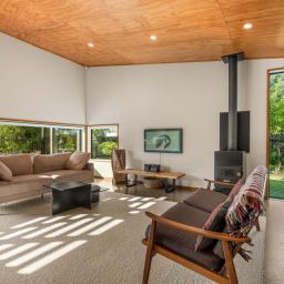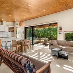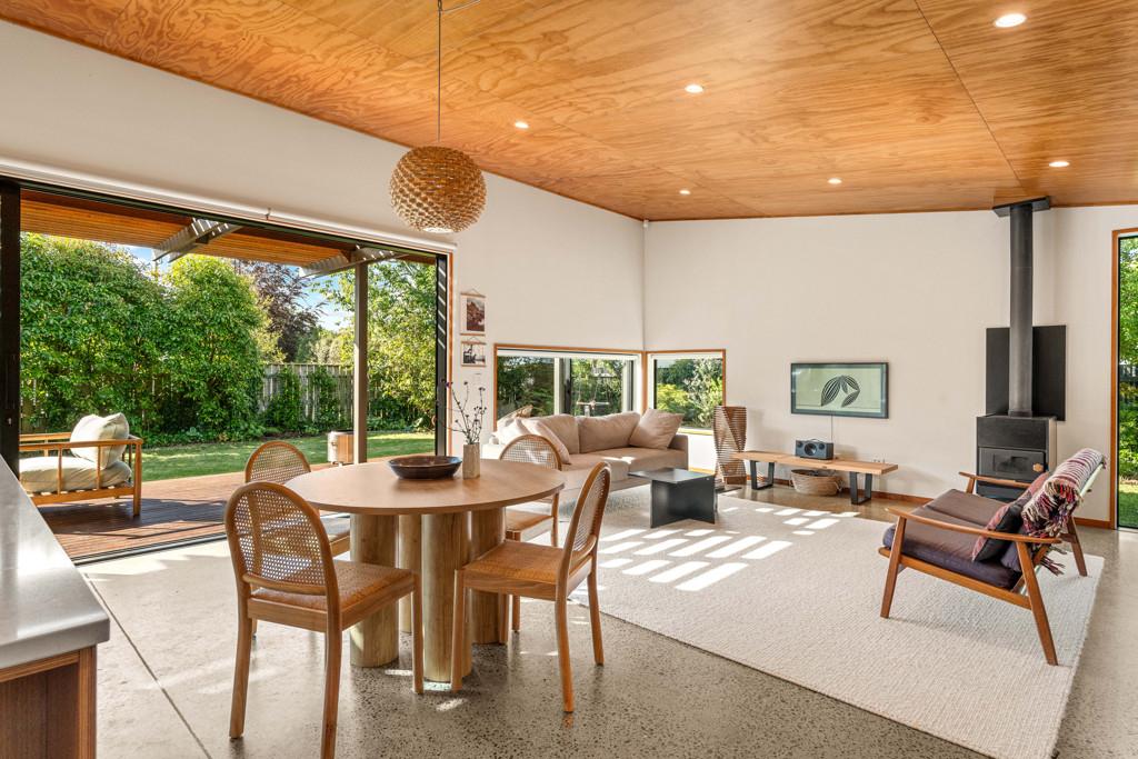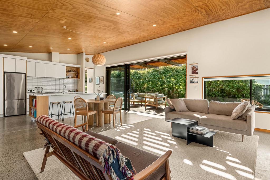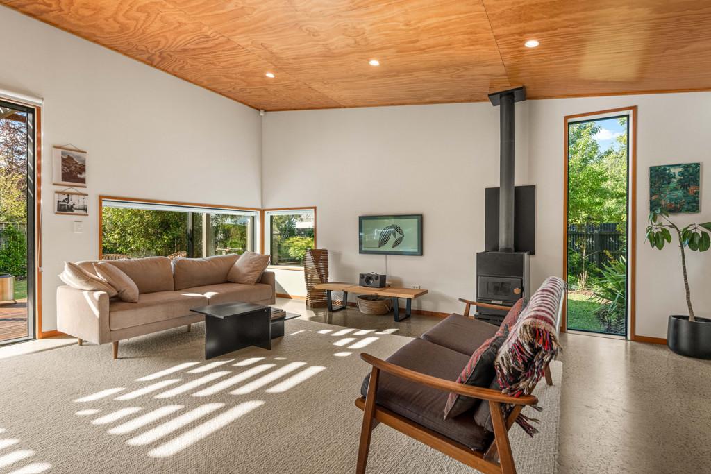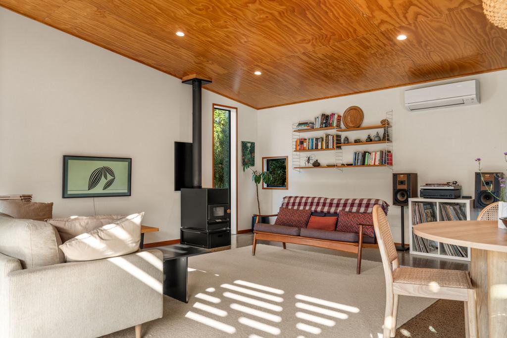 The open plan kitchen, dining and living area is designed to live as well as it looks. A sleek kitchen anchors the space, with a Pyroclassic wood burner and heat pump ensuring comfort all year round. Sun streams in through northwest facing windows, filtered by a brise soleil that softens summer light while letting winter warmth in. Living flows naturally to the sun drenched decking and covered outdoor areas, giving you flexibility for entertaining, relaxing or simply soaking up the light.