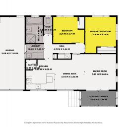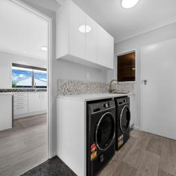 The kitchen has plenty of space with the highlight being an engineered stone benchtop. Light, bright and warm.
