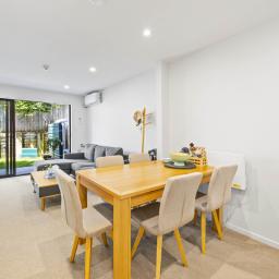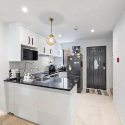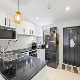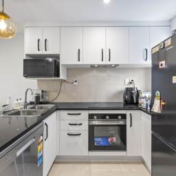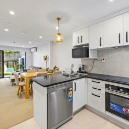 • The contemporary kitchen is equipped with quality appliances, an engineered stone benchtop, and a sleek tiled splashback.
