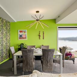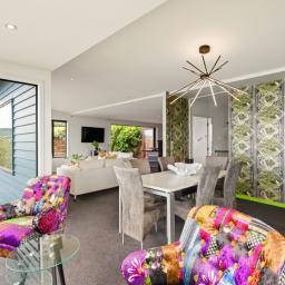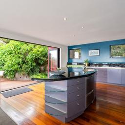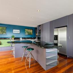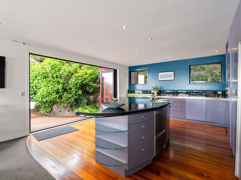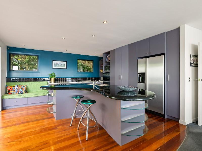 At the heart of the home lies the bespoke designer kitchen, where creativity and craftsmanship shine. A curved island bench, designed and crafted by John Calvert from maple ply, anchors the space, a true work of art that blends function with form. The organic shape of the island adds flow and warmth, while its functional side includes dual stainless-steel sinks, a sleek faucet and dish drawers. Generous storage ensures practicality, while the designated seating nook offers a cosy place for guests to relax, read, or chat with the host as meals or drinks are prepared. This is a kitchen alive with colour, shape and texture, designed around connection and comfort.