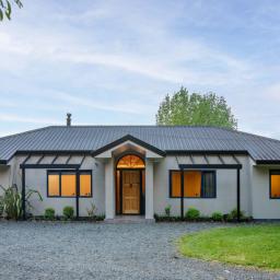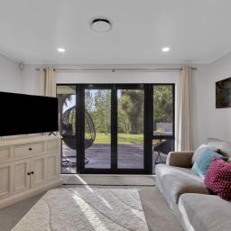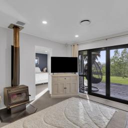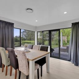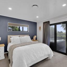 The dining room opens seamlessly to a relaxed outdoor lounging area-an ideal spot to enjoy the morning sun or host evening gatherings. The main bedroom extends directly to the spa pool, offering a private retreat with serene views across the water and countryside.