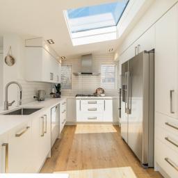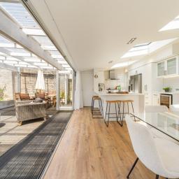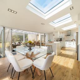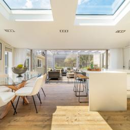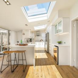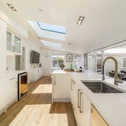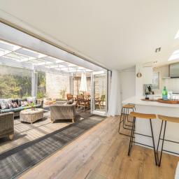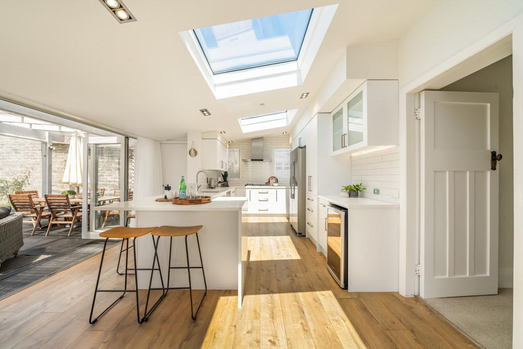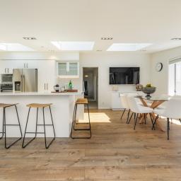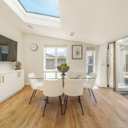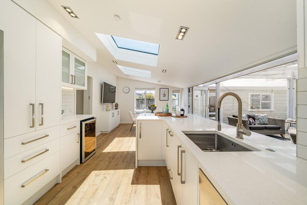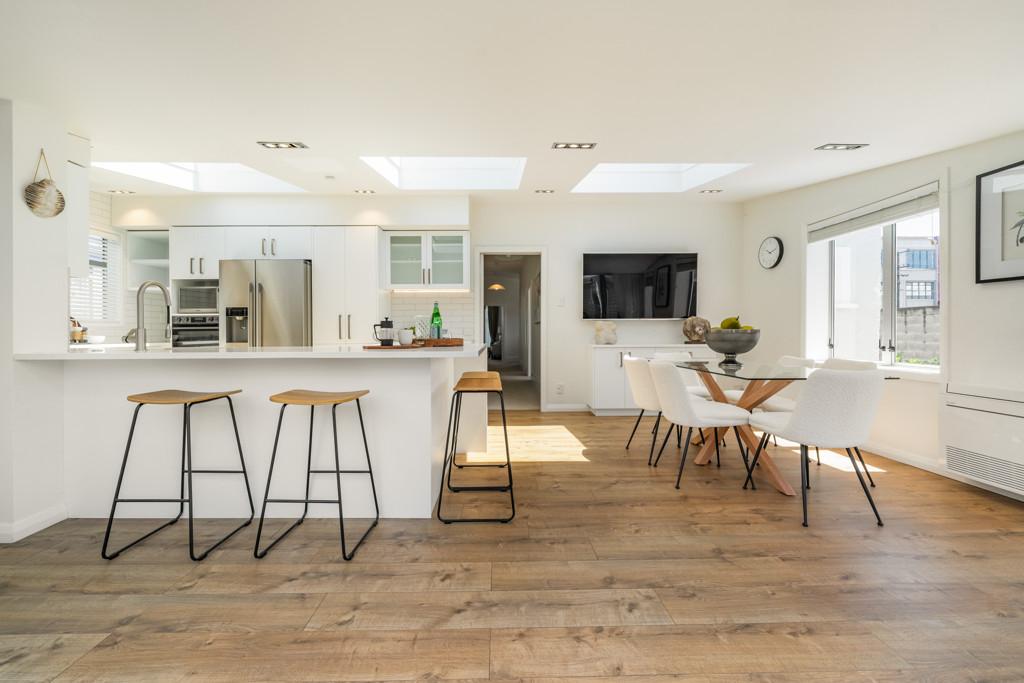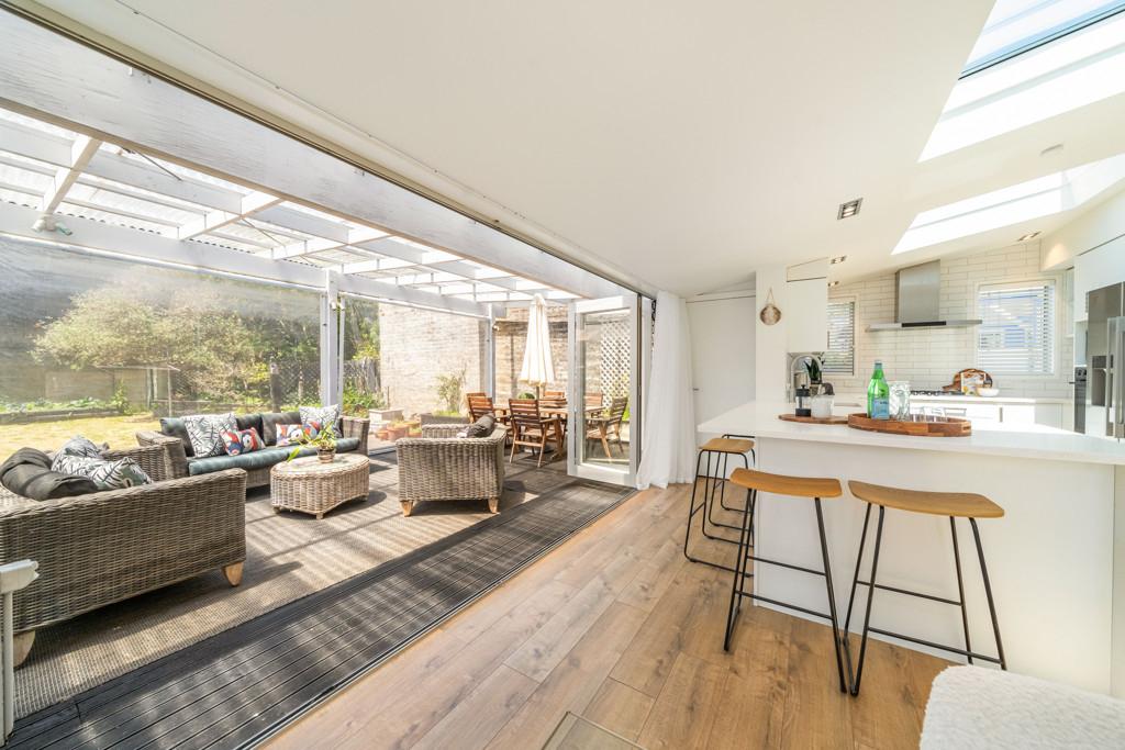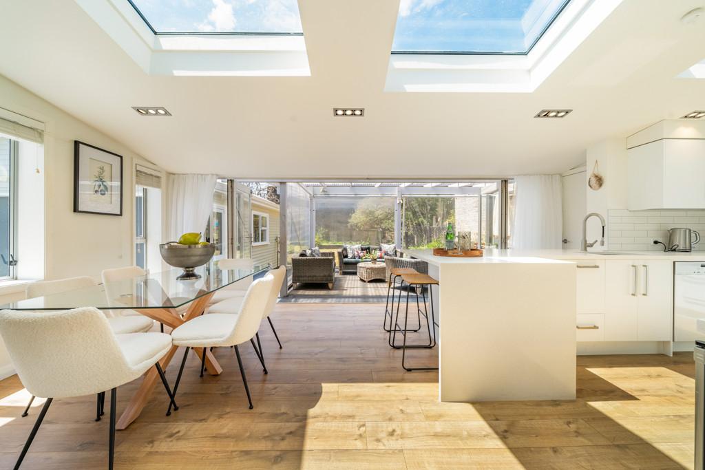 At the rear is the open plan living/dining/kitchen, with several skylights this area basks in light and sun throughout the day.