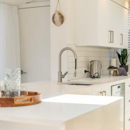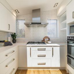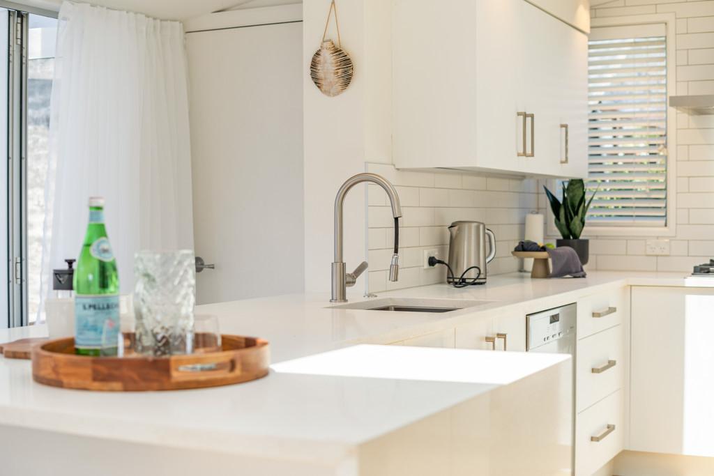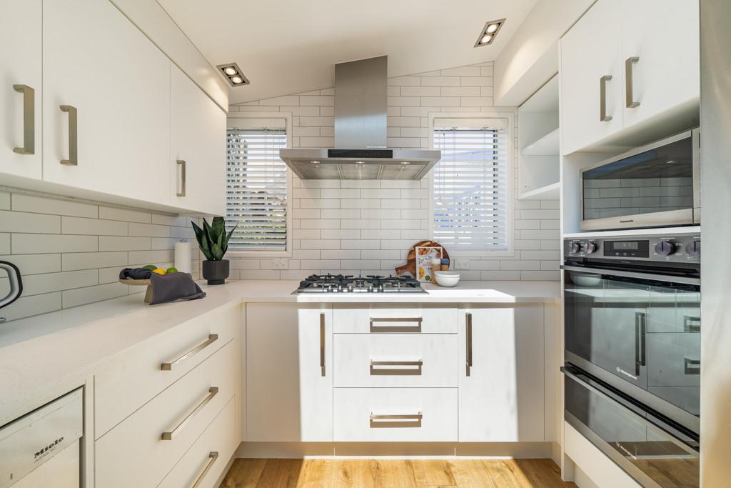 The modern, stylish kitchen has stone benches, quality appliances, double oven, and gas hob.