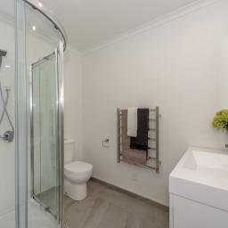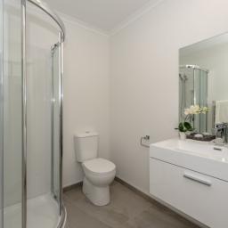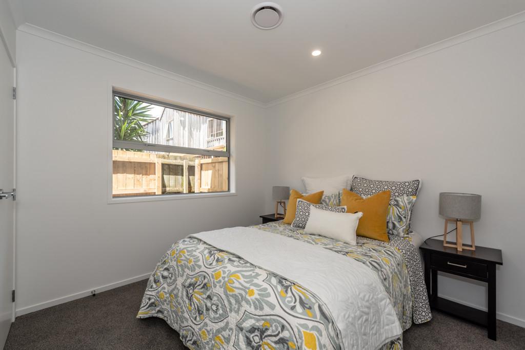 The floor plan offers excellent separation between bedrooms: the master suite, complete with its own ensuite, is positioned upstairs, while the second bedroom sits privately on the ground level next to a well-finished bathroom perfect for guests, teens, or flatmates. Both bathrooms feature tiled floors and polished chrome fixtures for a crisp, modern finish. Internal access garaging with a built-in laundry completes this neatly packaged home.