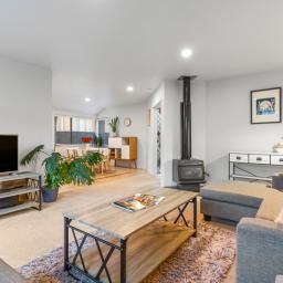 The centre of everyday life is the expansive open plan living area, designed for connection and relaxation. The modern kitchen is stylish and functional, featuring warm wooden benchtops, stainless steel appliances, and a fantastic breakfast bar for casual meals or morning coffee. This space flows seamlessly into the dining area and the spacious, carpeted lounge, kept incredibly cosy in winter by a powerful wood burner. But the real star is the exceptional indoor outdoor flow. Large sliding doors open from the living room onto a entertainers deck, an incredible extension of your home.