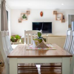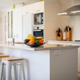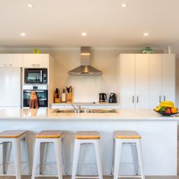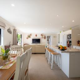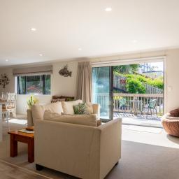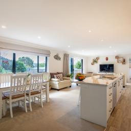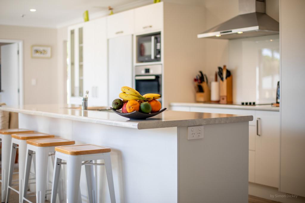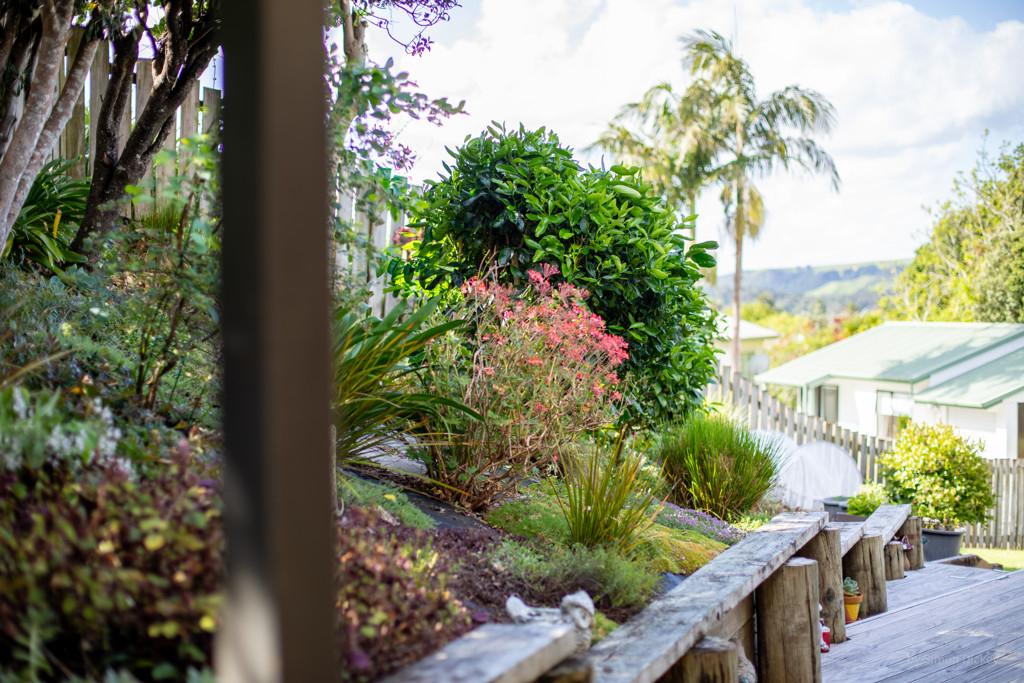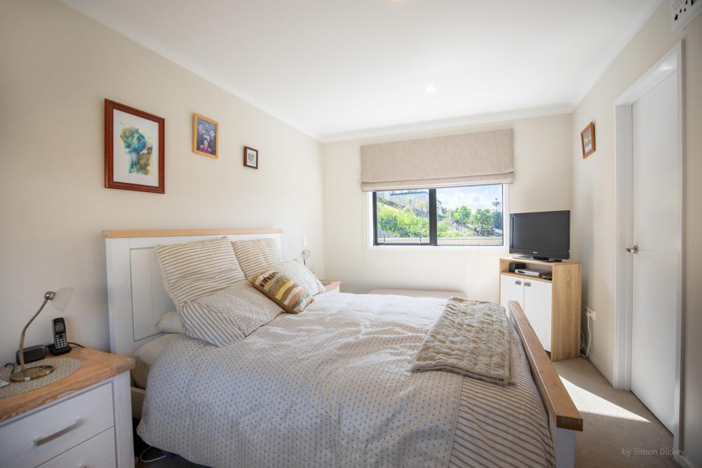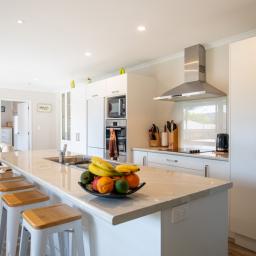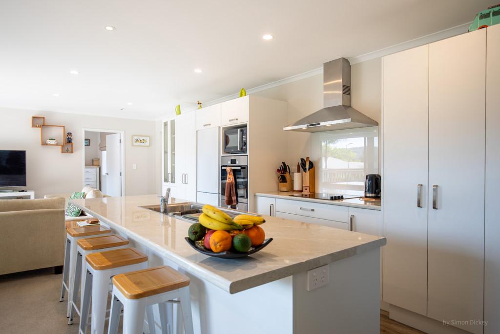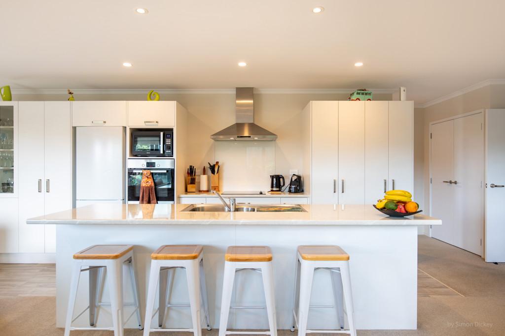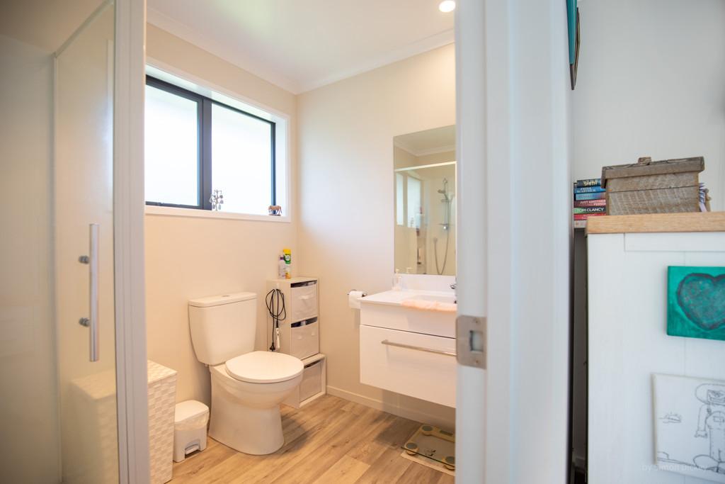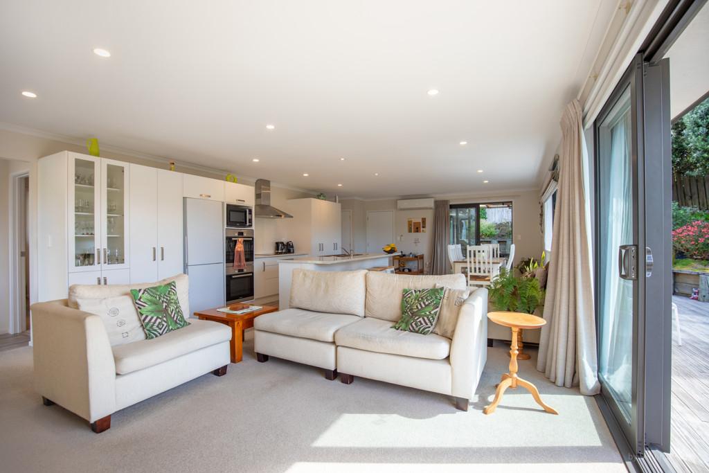The open plan living zone draws in natural light and opens from multiple angles to a generous deck, including a covered area for year round entertaining. Indoors, the modern kitchen sits at the centre with smooth flow to dining and living spaces, creating an easy environment for daily routines or hosting friends. The Raglan skyline provides the backdrop from morning to evening.