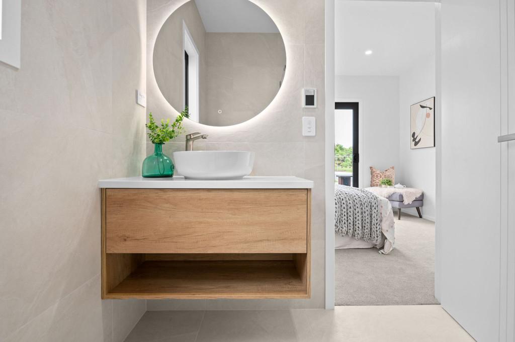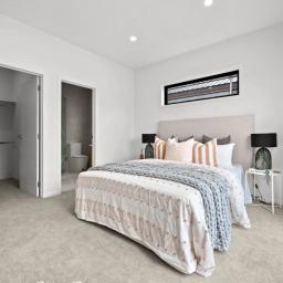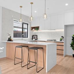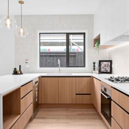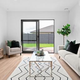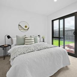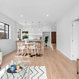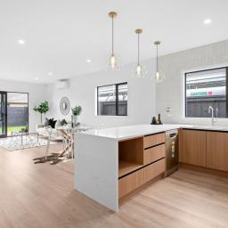 The central hub of the home is a stunning designer kitchen, complete with a large breakfast bar, quality appliances, well-appointed cabinetry and an impressive walk-in pantry. This flows effortlessly into the open-plan dining and living area, enhanced by a 2.7m stud height and large windows that bathe the space in natural light. Easy access through sliding doors leads to a private outdoor deck, ideal for alfresco dining or relaxed social gatherings.