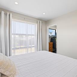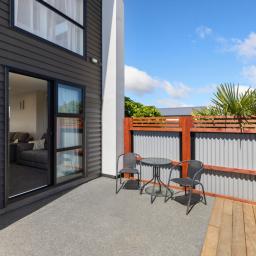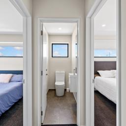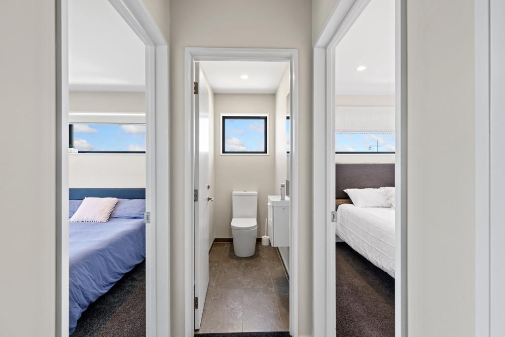 The layout is a fantastic pragmatic design. Open plan living and dining are immediately apparent on the ground floor, the modern kitchen featuring stainless appliances and ample storage. Fresh throughout in neutral tones, sliding doors connect the dining room to a central patio allowing you to entertain alfresco. The lounge area has a slider onto another decked area, meaning choices for all times of the day. Two double bedrooms all of which have built-in wardrobes are on the second level. The secondary bedroom has a glimpse of a lake view. The master has a walk in wardrobe and mountain vista. A separate toilet and laundry are another added bonus.