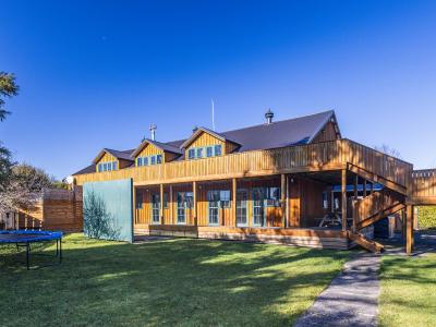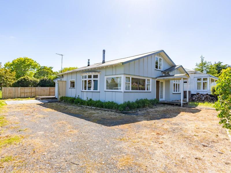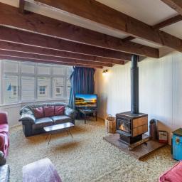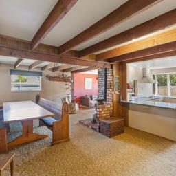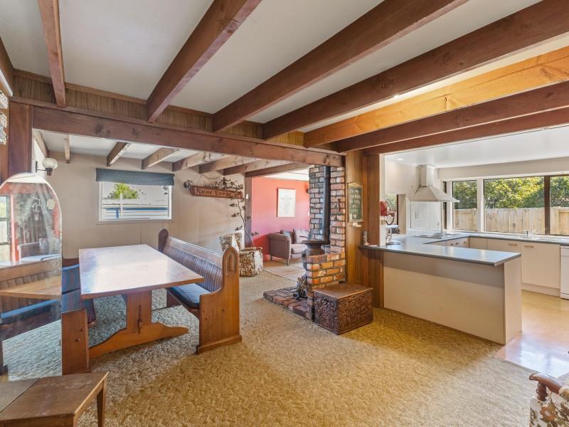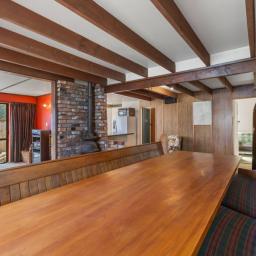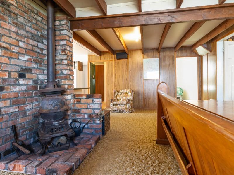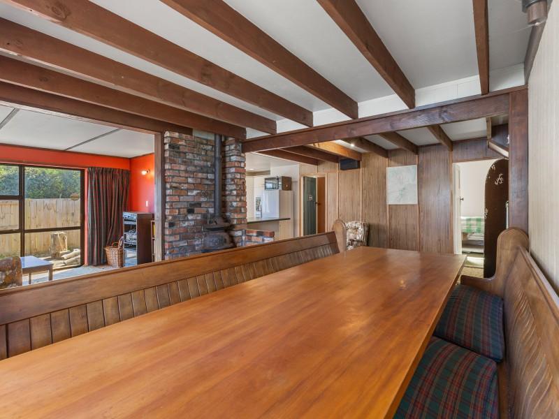 Downstairs are three double bedrooms and one single, a large separate lounge with wood burner, and at the rear of the home is the living area with dining room and another wood burner, sitting room, and kitchen. The dining room features a huge and spectacular kauri table with two beautiful pews that came from the Waimati Church many years ago. And we also have two bathrooms and two separate toilets.
