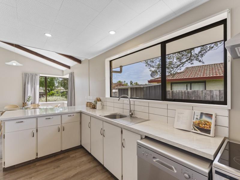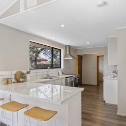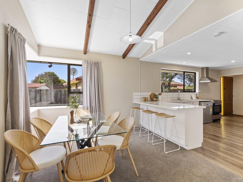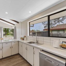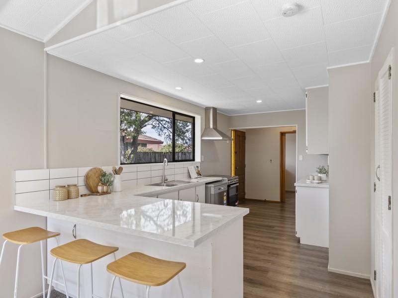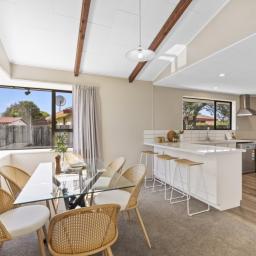 Inside, three generously sized bedrooms are complemented by a recently modernised family bathroom and separate toilet, providing comfort and convenience for daily family living. The large open-plan kitchen anchors the home, offering ample bench and cupboard space and effortless connection to the dining area, where a bay window frames the garden and fills the room with natural light.