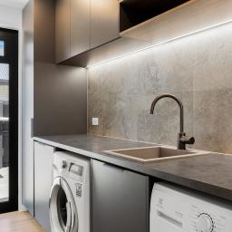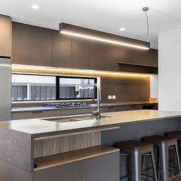 - Designer kitchen with stone benchtops, seamlessly extending to the open pantry and quality appliances anchoring the open plan living zone.