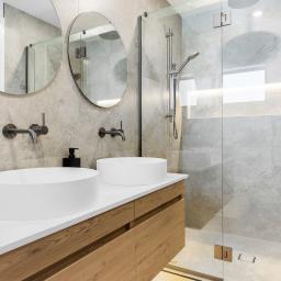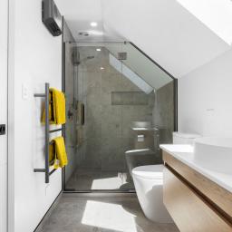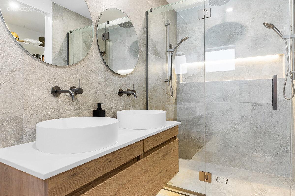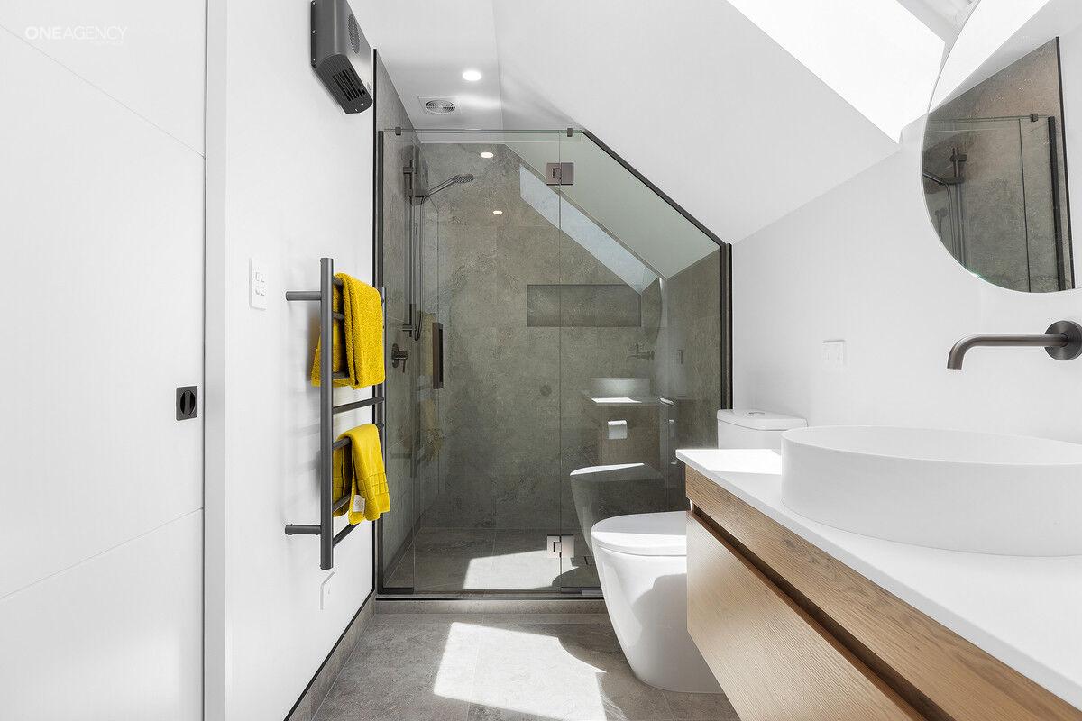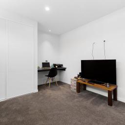 - Master bedroom positioned on the ground floor, featuring a walk-in wardrobe with custom joinery, a tiled ensuite, and direct outdoor access.