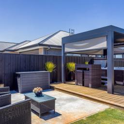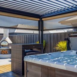 - Extended outdoor entertainment space with electric louvred pergola, spa pool, and outdoor fire with pizza oven.