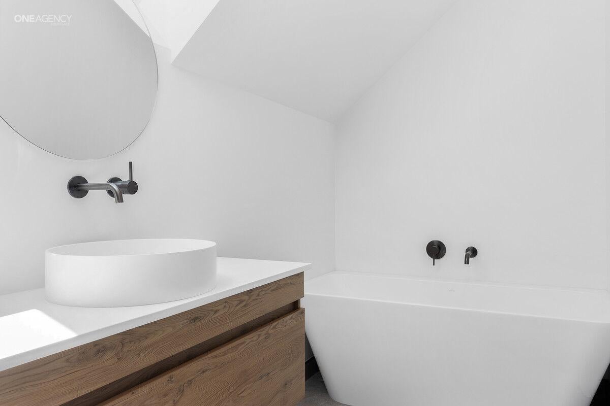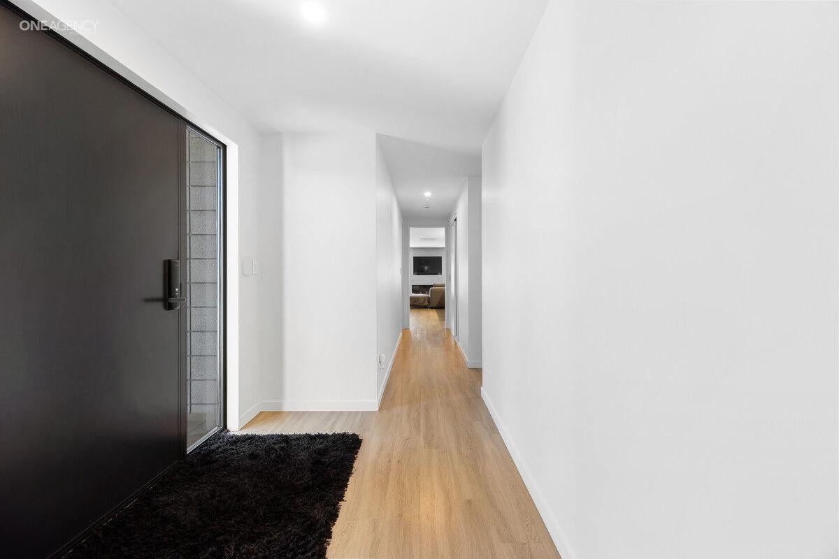 The home's striking concrete block and plaster exterior sets the stage for the contemporary style found within. Stepping inside, the central open-plan living area welcomes you with its warm ambience, designer kitchen, and seamless indoor-outdoor flow. A separate formal lounge provides an additional living zone ideal for quiet relaxation, movie nights, or hosting guests.