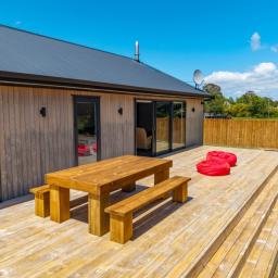 There are two double bedrooms, bathroom and a master bedroom with walk-in wardrobe and ensuite, sweet! The open plan living area includes the lounge, dining and kitchen with an island bench connecting it all together. And outside the open plan living and connected by a large slider and even a door directly from the kitchen, is a huge deck on the sunniest side of the house. It's massive with steps every which way, a wonderful spot that you will use so much!