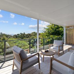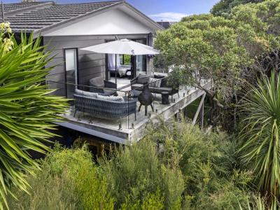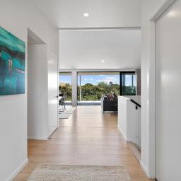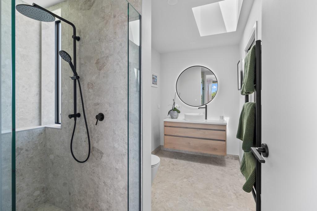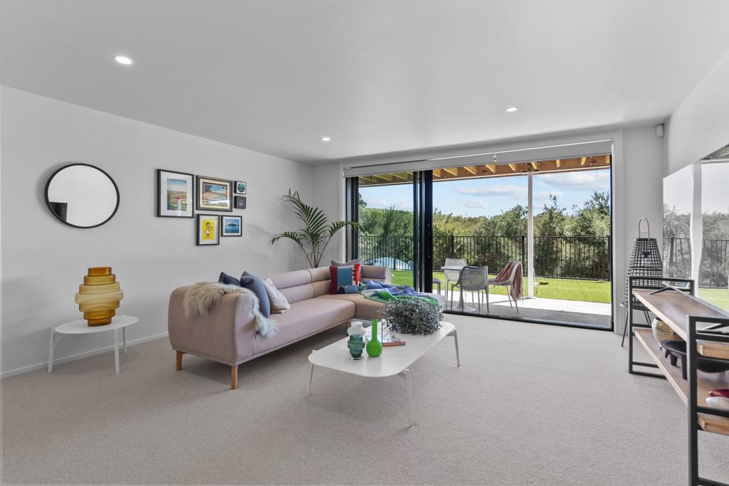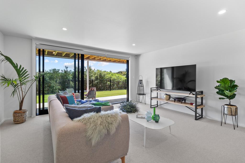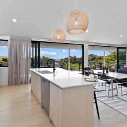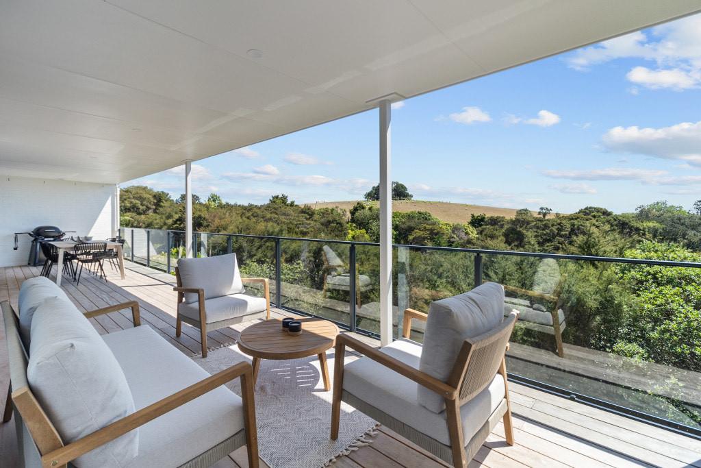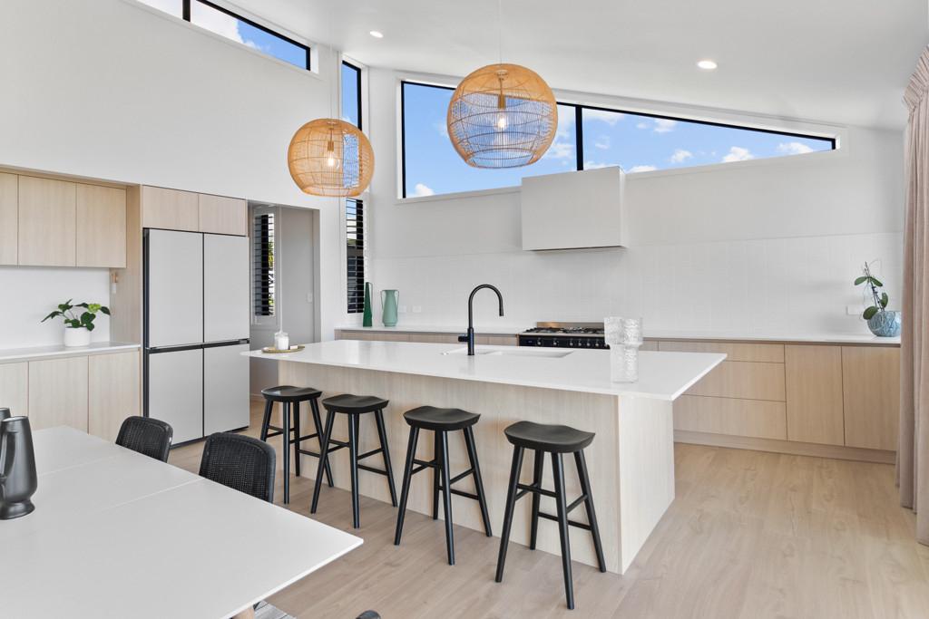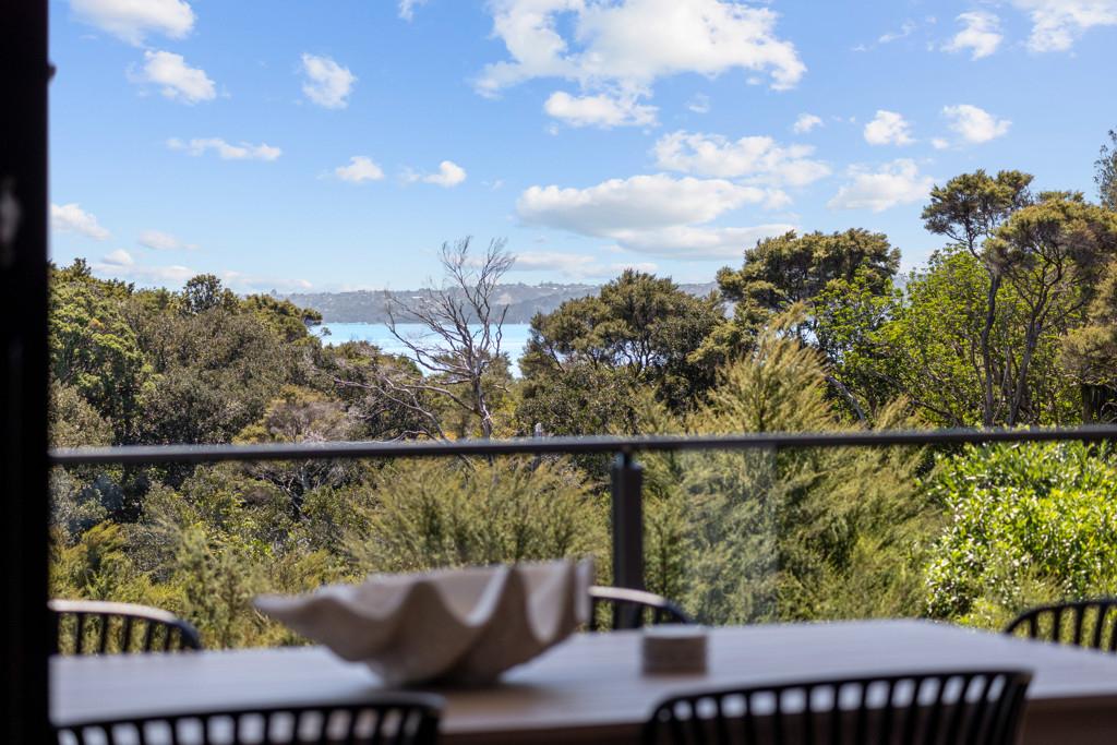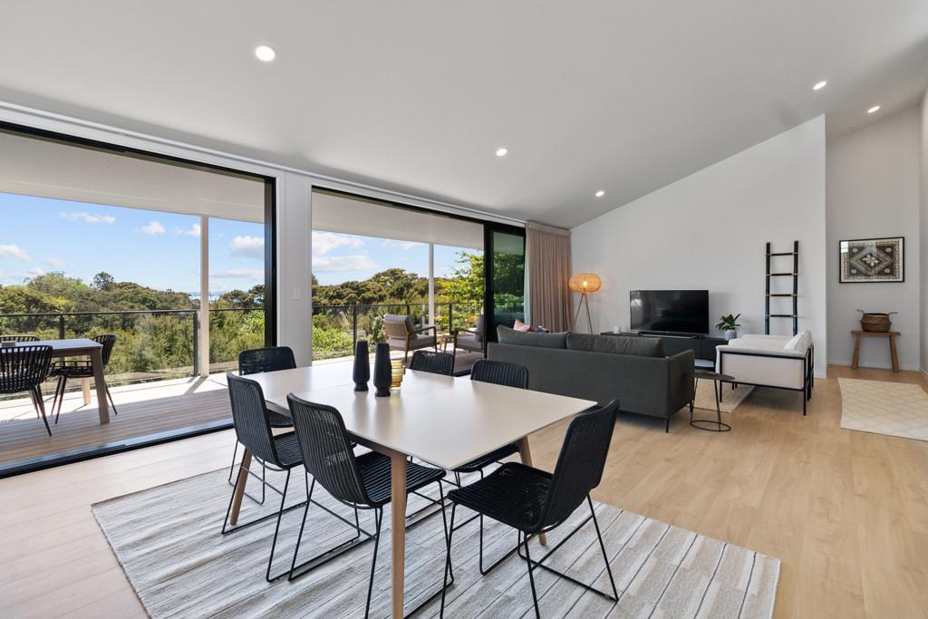 Elevated and light-filled, the upper level showcases an impressive open-plan design with high-stud ceilings that amplify the sense of space, a luxury, designer chef's kitchen with a full butler's pantry, and expansive floor-to-ceiling sliders that extend seamlessly to a north-facing covered deck capturing sweeping views across Omana Reserve to the Tamaki Strait and Waiheke Island.