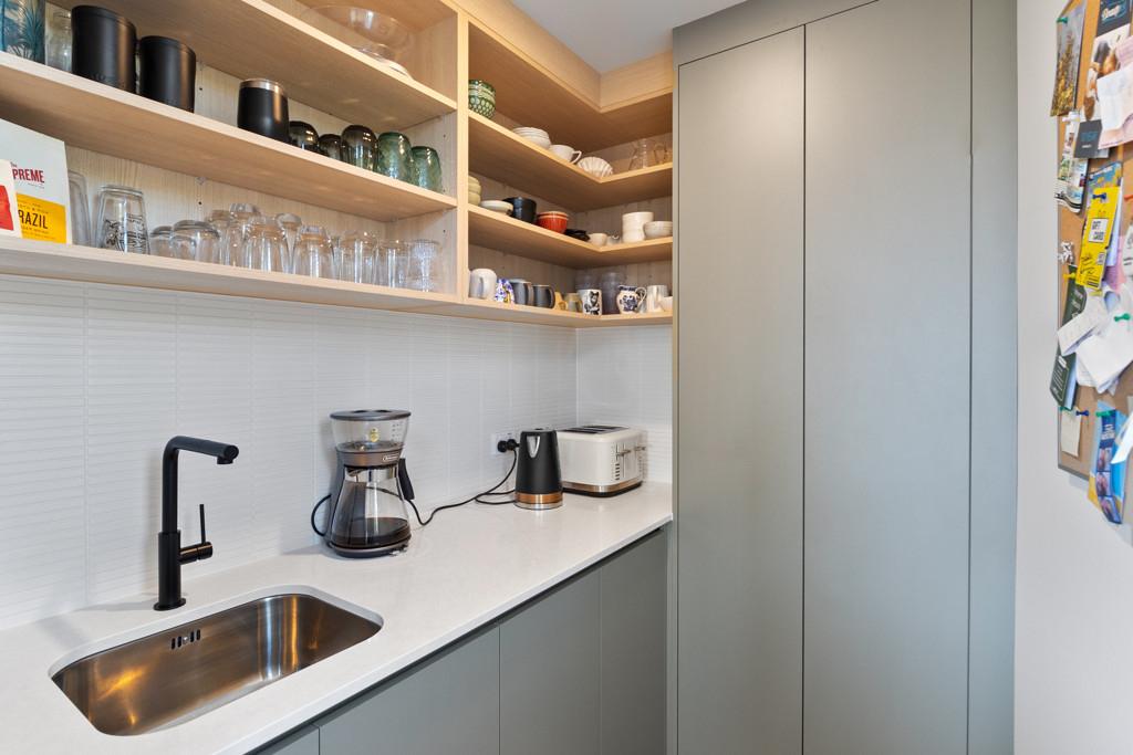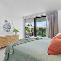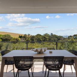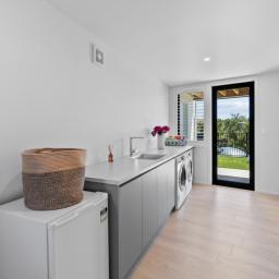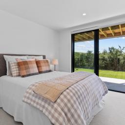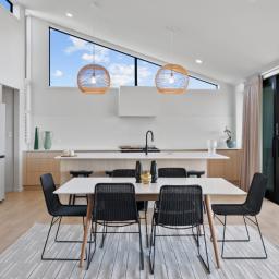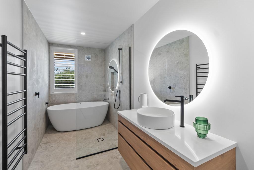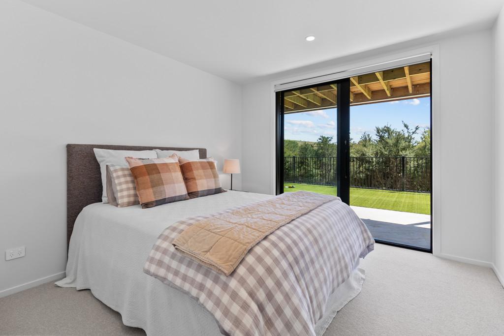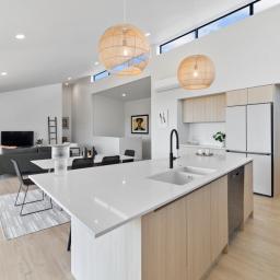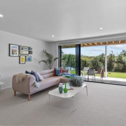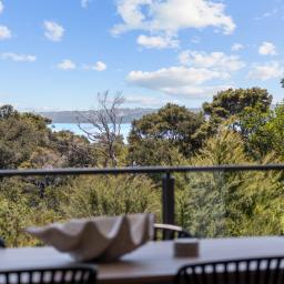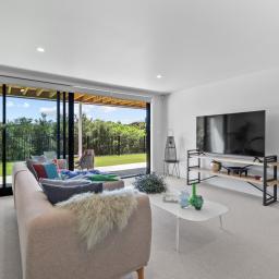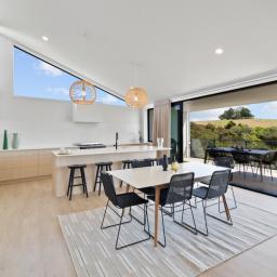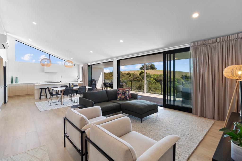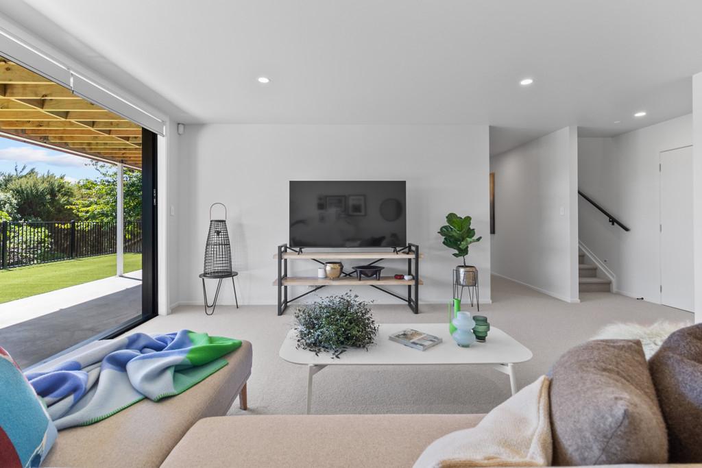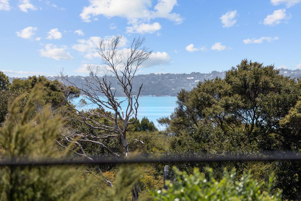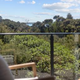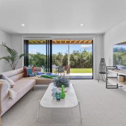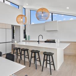 Elevated and light-filled, the upper level showcases an impressive open-plan design with high-stud ceilings that amplify the sense of space, a luxury, designer chef's kitchen with a full butler's pantry, and expansive floor-to-ceiling sliders that extend seamlessly to a north-facing covered deck capturing sweeping views across Omana Reserve to the Tamaki Strait and Waiheke Island.
