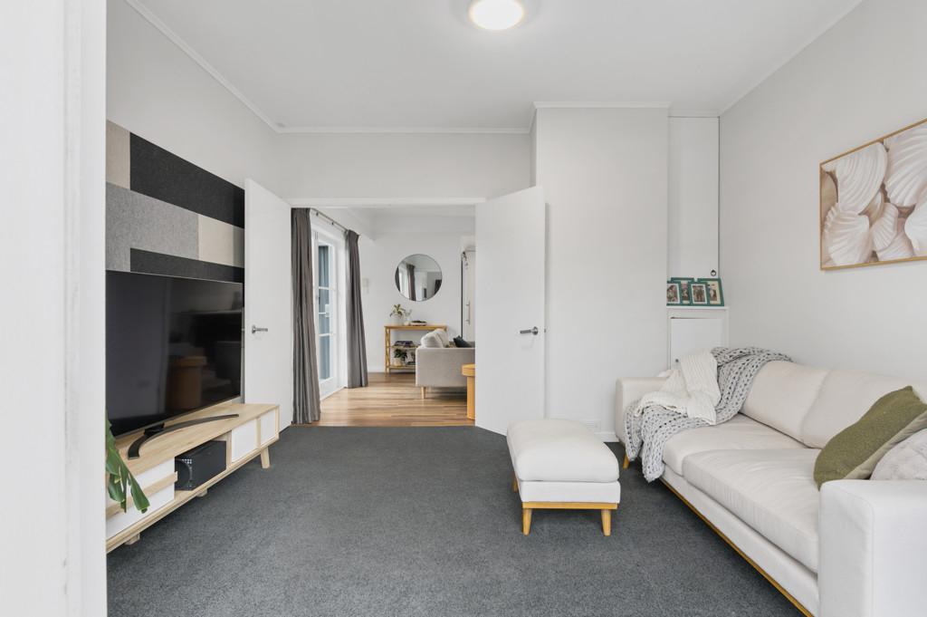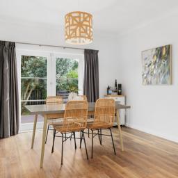 The home boasts two living spaces, ideal for relaxed family time and entertaining, with French doors opening to the front deck. The main living area is warm and inviting, while the second living area offers versatility. The dining area is a true centerpiece, illuminated by a stunning David Trubridge light, and opens to the sun-drenched rear deck. The front deck is perfect for morning coffee, while the rear deck is an entertainer's dream.