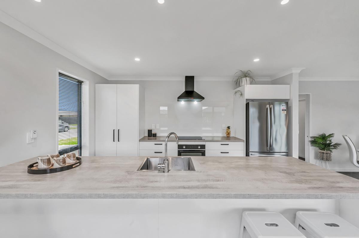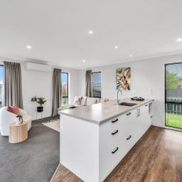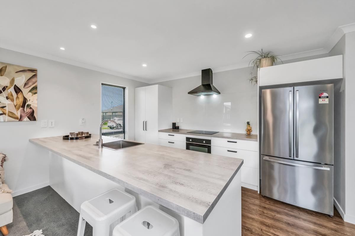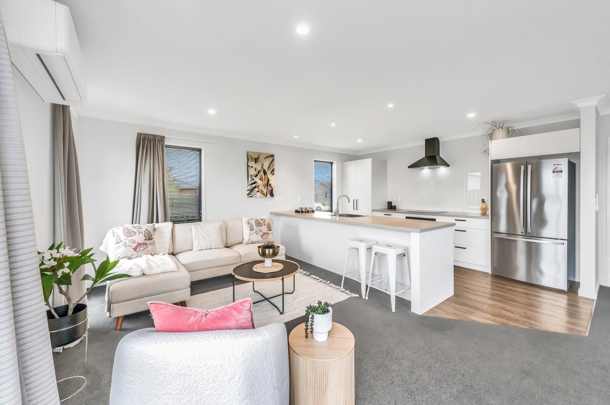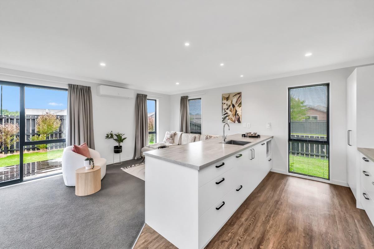 Step inside to an inviting open-plan kitchen, dining, and living zone—all bright, warm, and effortless thanks to a heat pump and sliding doors that spill out to the generous backyard. The kitchen is crisp and practical, complete with an island bench and a clear line of sight across the living space.