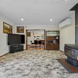 Designed for effortless family living, the home spans two levels and boasts four bedrooms plus a study, three bathrooms, and an array of flexible living spaces. The open-plan kitchen and dining area flows seamlessly to the outdoors, while the large interconnecting lounge, with its wood fire and heat pump, creates a warm and inviting retreat all year round.