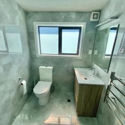 • Modern, fully tiled bathroom with glass shower and heated towel rail