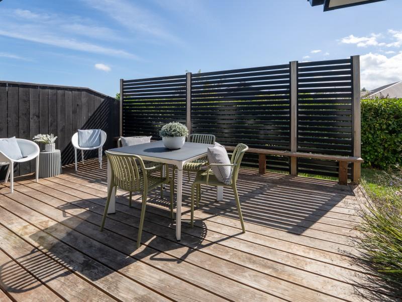 The low-maintenance outdoor area is perfect for those who appreciate the benefits of outdoor living without the hassle of extensive gardening work.
