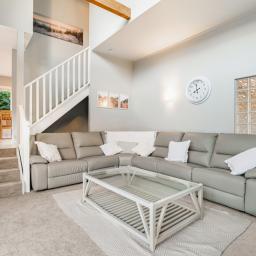 The extra-large double garage with internal access provides secure parking and plenty of room for tools, hobbies, or beach gear.