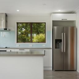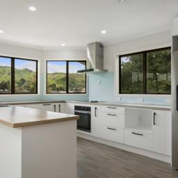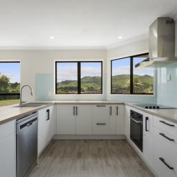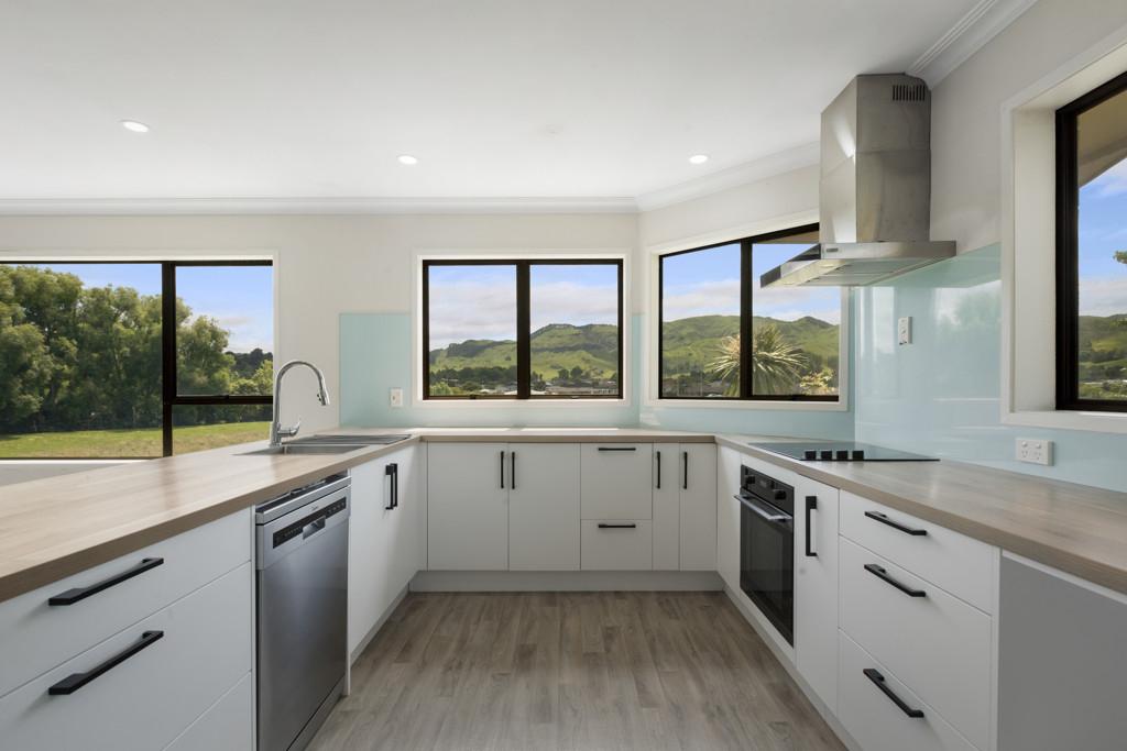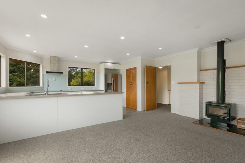 Designed for family living, the light-filled lounge showcases expansive windows that invite daylight in while framing breathtaking park and hillside vistas. A heat pump keeps the space comfortable year-round, while ranchslider doors flow effortlessly to an elevated deck perfect for entertaining or relaxing. The open-plan kitchen and dining area has been updated with contemporary appliances, generous cabinetry, and a built-in woodburner for cozy winter evenings.
