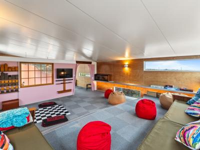 Two living spaces offer two very different worlds: one wrapped in the crackle of a cosy fireplace, the other lined with bookshelves that seem to hide stories of their own.