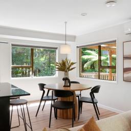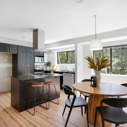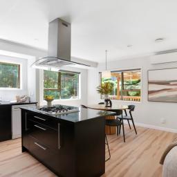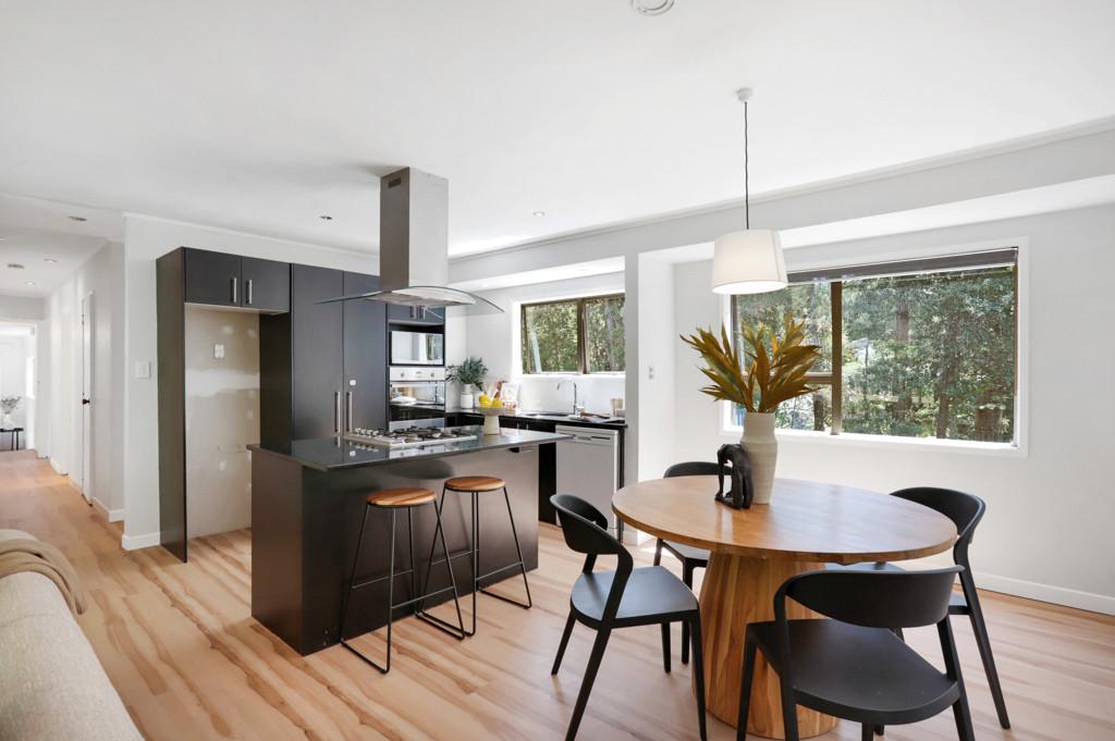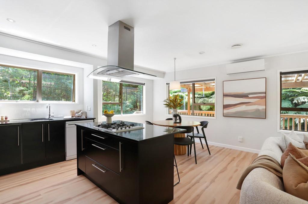 At the heart of the home is the open plan kitchen, dining and living area - bright, welcoming, and perfectly positioned to capture all day sun. The kitchen is sleek and stylish, featuring black cabinetry and an engineered stone benchtop, and it flows effortlessly onto an expansive, private deck - ideal for entertaining or simply unwinding while taking in breathtaking views over the native bush. With a surrounding bush reserve as its backdrop, peace and privacy are paramount.