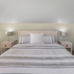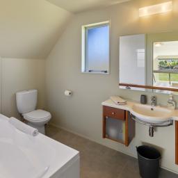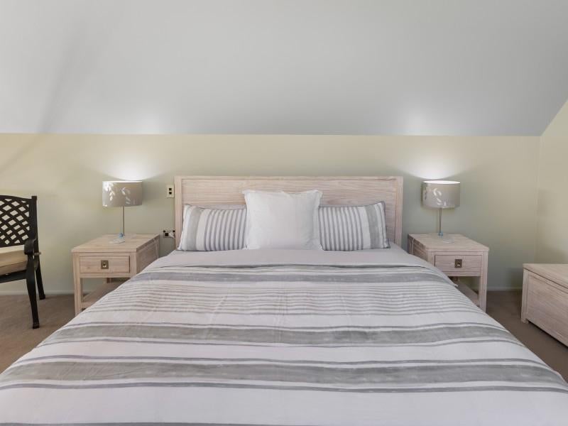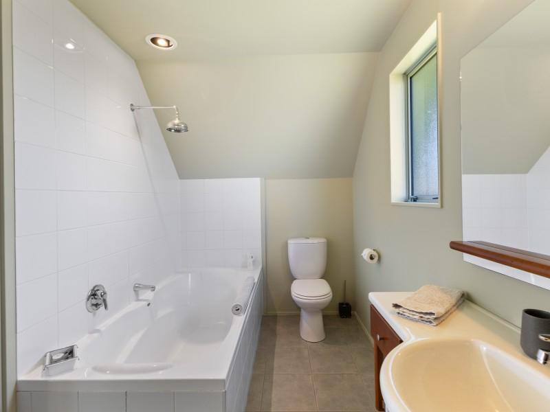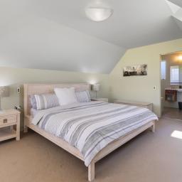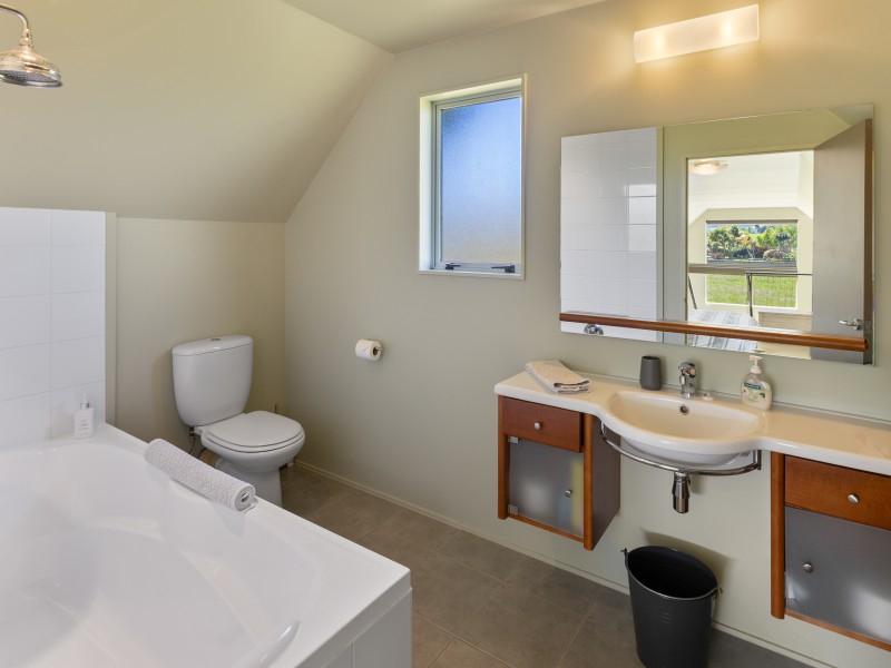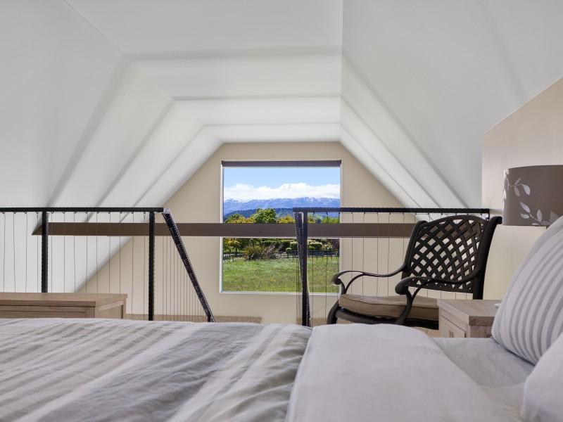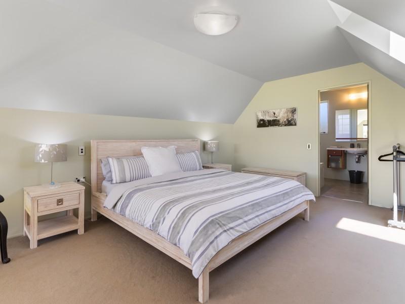 Back inside, let's head upstairs! A large double bedroom on the mezzanine floor has a massive super king bed, a skylight and more stunning views. The spacious bathroom also has a heated floor, a large bath and shower over bath, vanity and another toilet.