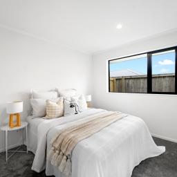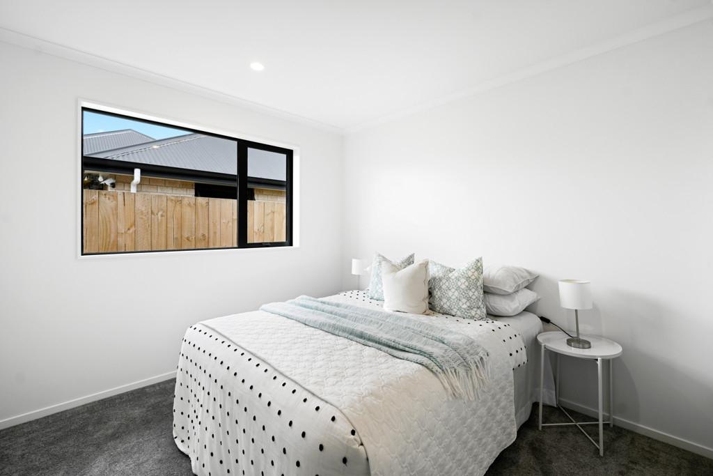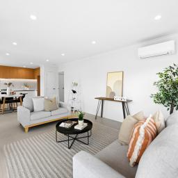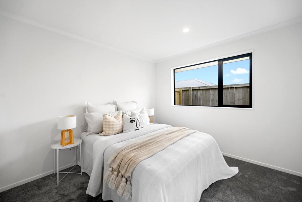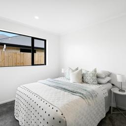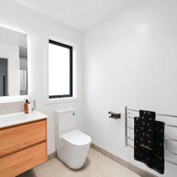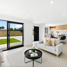Lot 11 features a spacious living and dining area that seamlessly connects to a deluxe kitchen equipped with engineered stone benches. There are three generously sized bedrooms that share a stunning bathroom, complete with a glass and tiled shower and two toilets. Stay cozy year-round with climate control provided by a heat pump. Summer entertaining will be a breeze in the outdoor courtyard, accessible through sliding doors, making it the ideal spot for BBQs.