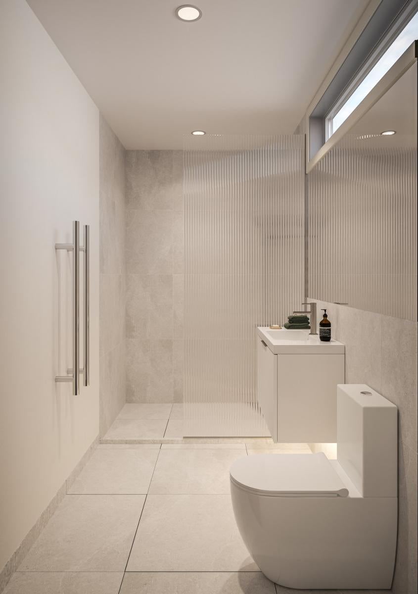 - Modern tiled bathrooms with oversized demisted/heated mirror, fluted glass shower and designer vertical heated towel rails