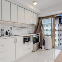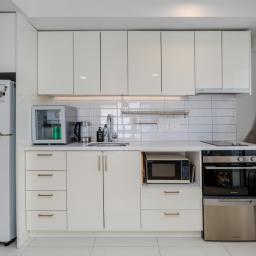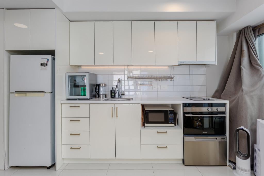 The chic and fresh interior allowing for masses of natural daylight to illuminate contemporary open plan living and dining areas. Doors stack back to reveal a full length glass balustrade balcony providing welcome cross ventilation and a chance to expand the room when entertaining a crowd. The sleek little galley kitchen features tiled floor and walls, with Fisher & Paykel underbench oven and DishDrawer integrated into glossy neutral toned cabinetry storage.