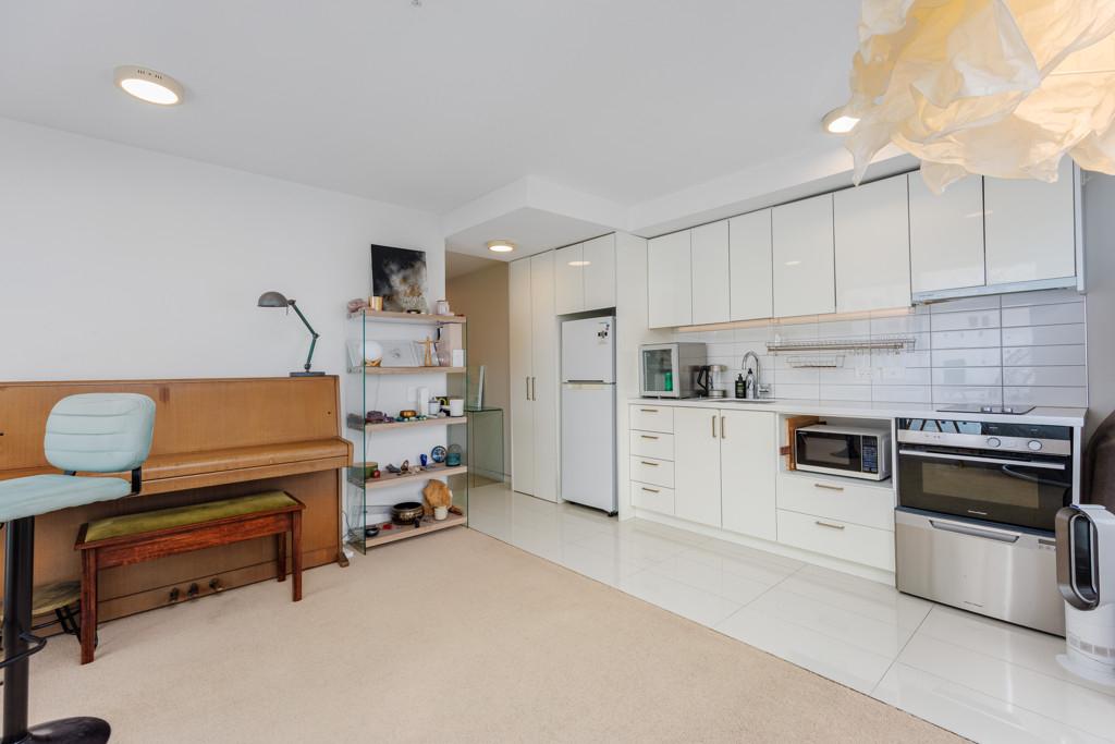 The bedroom has a built in closet and sits adjacent to the tiled bathroom combining frameless glass shower alcove, vanity, heated towel ladder and toilet. A hideaway cupboard is provided for a stacked laundry system and for those needing somewhere for their vehicle, options are available to rent a basement carpark for approximately $70 per week.