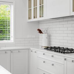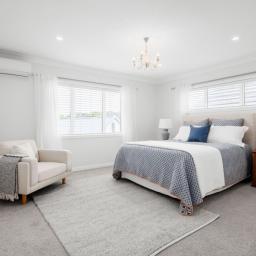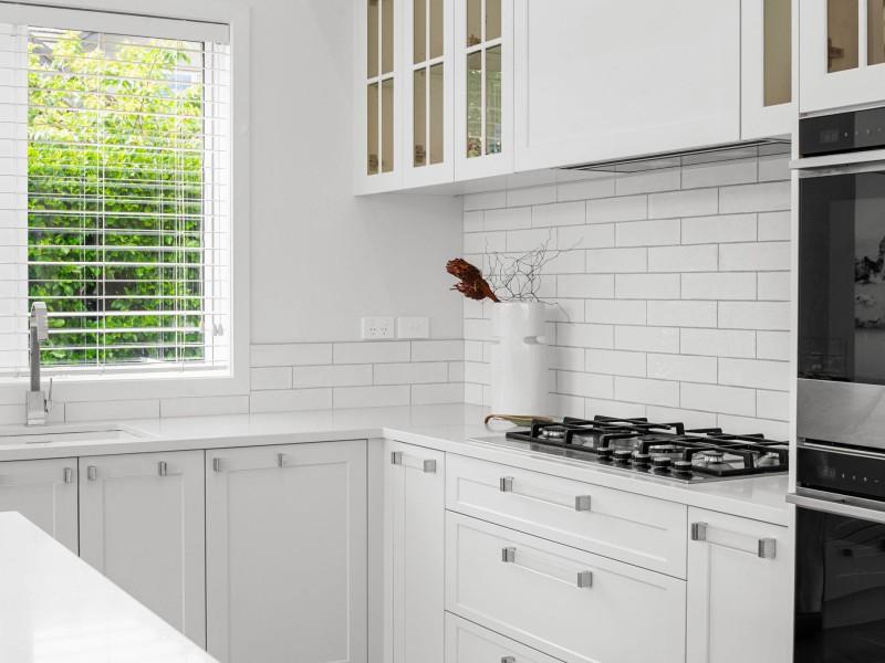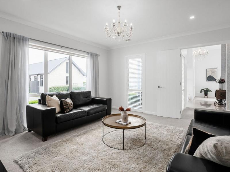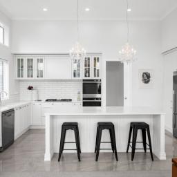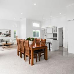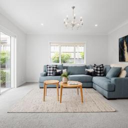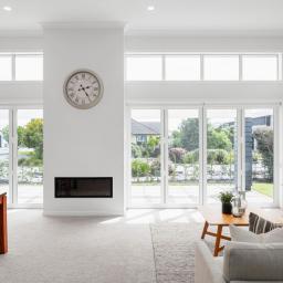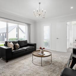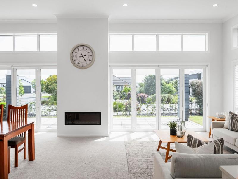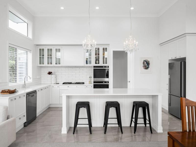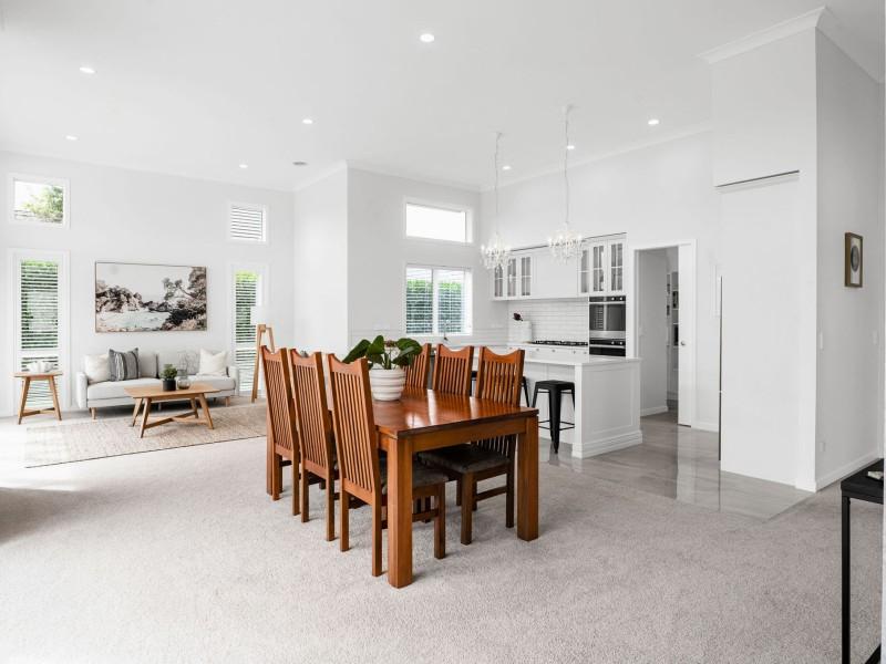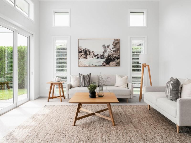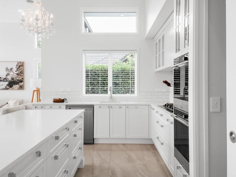 Step inside and immediately feel the generosity of space created by soaring 3.6m stud ceilings, flooding the open-plan living zone with natural light. This central living area is anchored by a sleek gas fireplace and flows effortlessly to the French-country inspired kitchen — an entertainer’s delight featuring engineered stone benchtops, double wall ovens, and a fully fitted walk-in butler’s pantry.