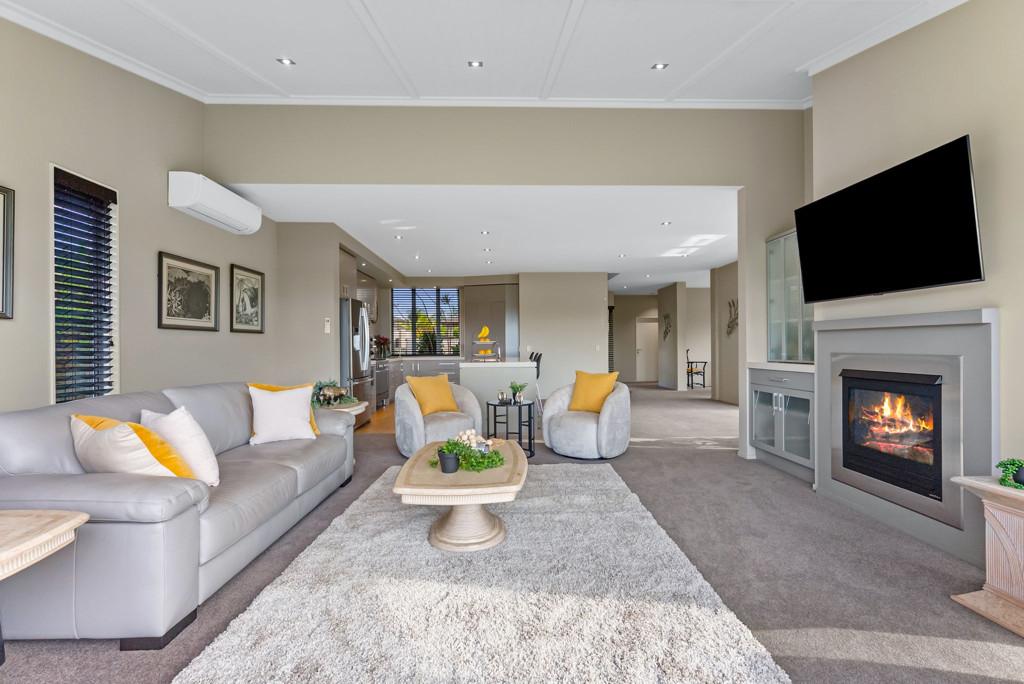 Step inside to discover a beautifully maintained interior with modern finishes and a warm, inviting atmosphere. The heart of the home is the stylish kitchen, featuring stone-top benches and a generous breakfast bar, which flows seamlessly into the open-plan dining and living area, complete with a fireplace for those cooler evenings. A separate lounge provides a more intimate living space or can be utilised as a formal dining room, as the current owners have chosen to use it.