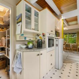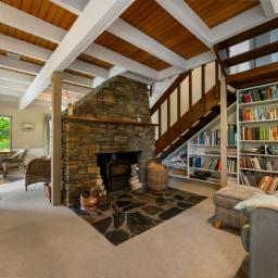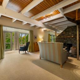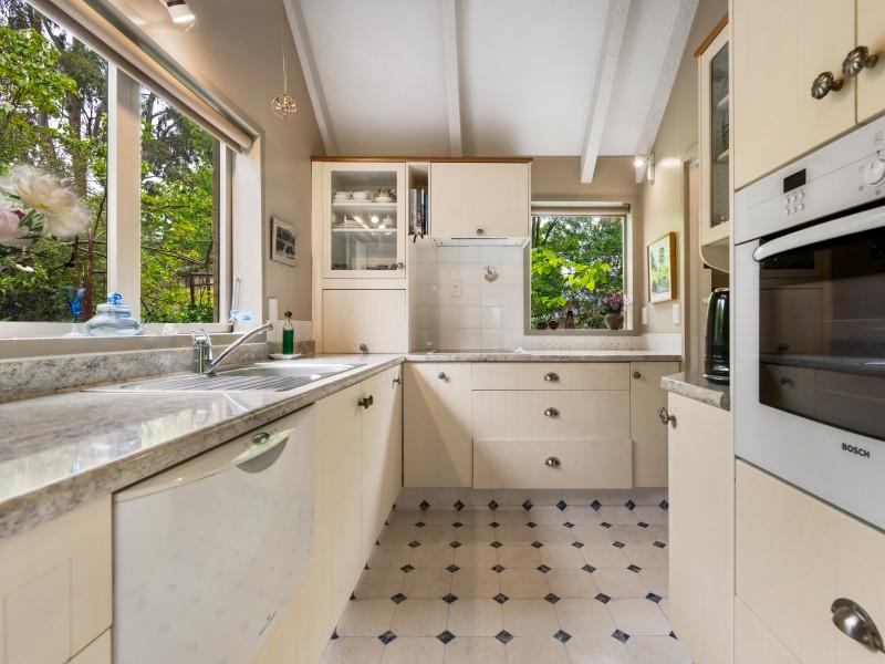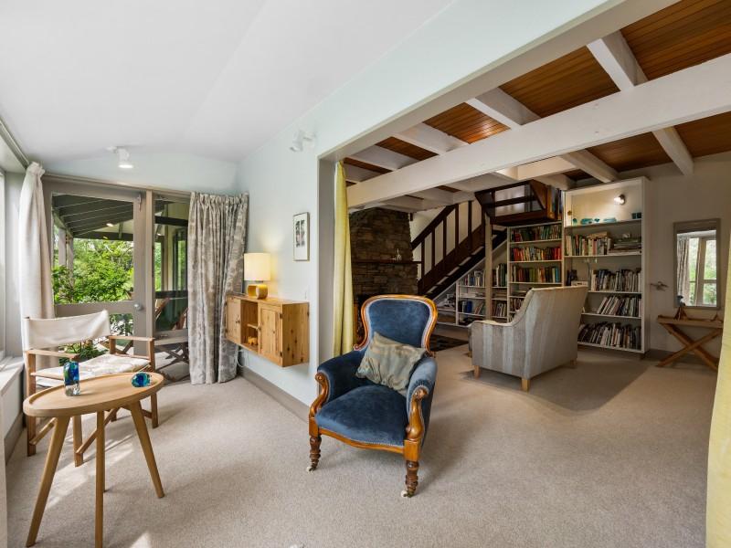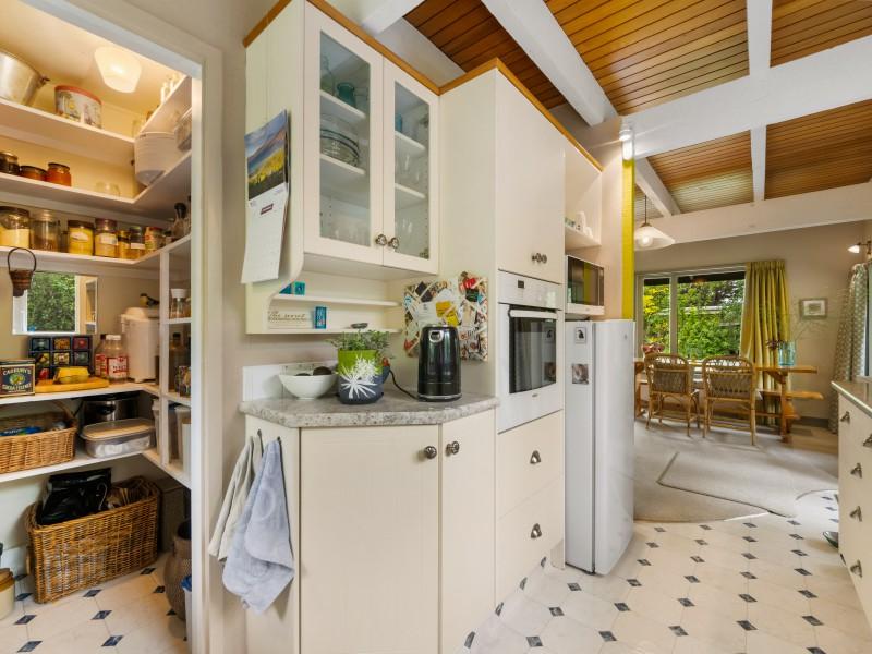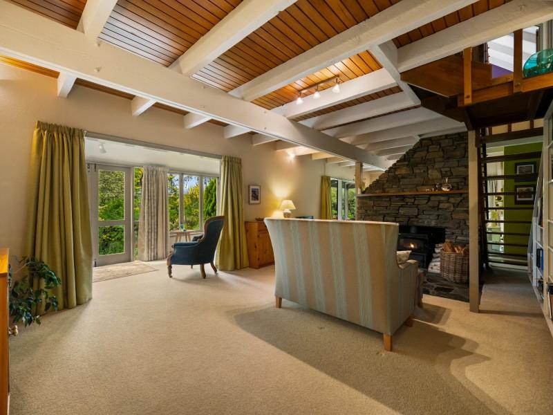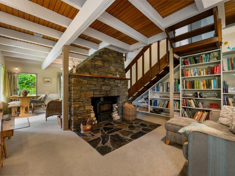 Step inside to discover rimu T&G ceilings, exposed beams, and a striking schist-surround fireplace that infuse the home with warmth and character. The cottage-style kitchen is both charming and practical, featuring a generous walk-in pantry.