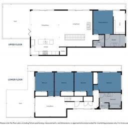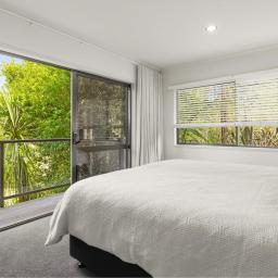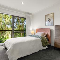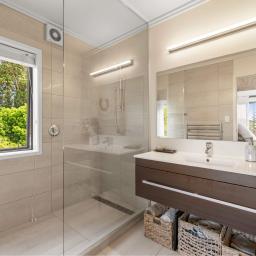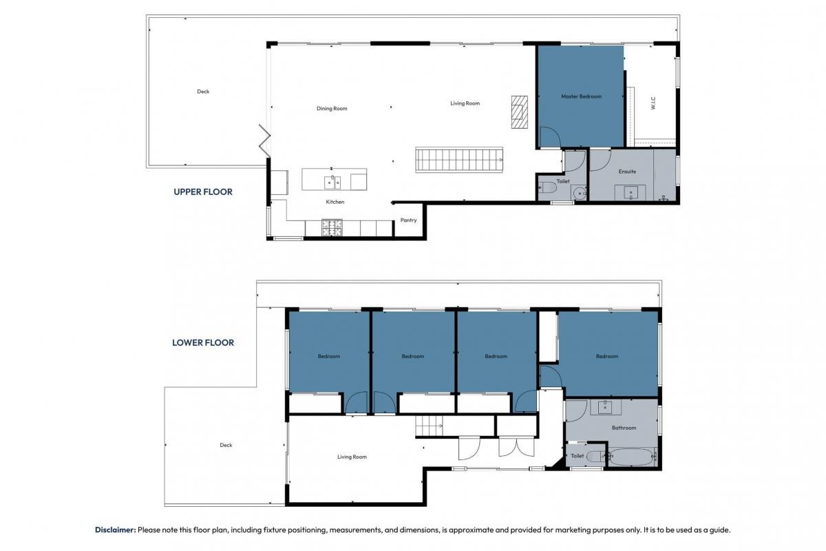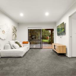 The lower level is configured for family flexibility. In addition to the second living area and the convenient cupboard disguised as a laundry, there are four double guest bedrooms, each with built-in wardrobes, floor-vented heating, and access to the lower decking extension where peaceful views are framed by the bush-filled backdrop. The main bathroom serves this level to ensure comfort for the family and guests. Above, the master suite boasts a spacious walk-in wardrobe, external deck access, handy mezzanine storage, and semi-private use of the adjoining upstairs bathroom and separate toilet.