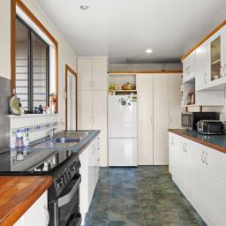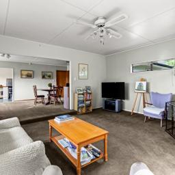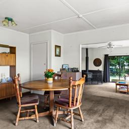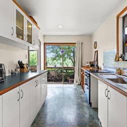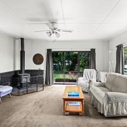 Offering three bedrooms and two generous living areas, the home is well-suited to comfortable family living. A heat pump, wood burner, and heat transfer system keep the home warm and inviting throughout the seasons. The separate kitchen carries a welcoming country-cottage feel, providing plenty of space for everyday use and presenting an excellent opportunity for a stylish modern refresh.