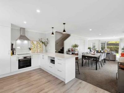 The open plan kitchen, living and dining area is light-filled and welcoming, with a second lounge offering flexibility for families and guests. The sleek kitchen comes with quality appliances and ample storage.