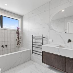 The outdoor area is thoughtfully landscaped with a concrete patio and pizza oven, raised planter boxes and low maintenance gardens, perfect for relaxing or hosting gatherings. Both bathrooms are tiled from floor to ceiling for a clean, modern aesthetic, with underfloor heating for year round comfort. The master ensuite includes a walk-in shower with dual shower heads and a built-in bath. All bedrooms include built-in wardrobes, and the double garage offers practical storage with shelving, ply lined walls and a dedicated laundry area.